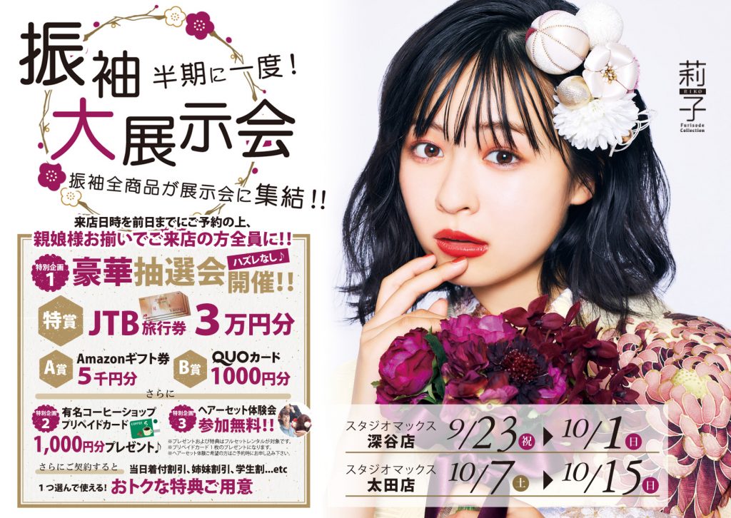 2023.9.3 スタッフブログYoutube深谷店成人式 ■深谷店■振袖大展示会のご紹介■ 最新のお知らせや情報は▷▷ココ◁◁をチェック! こんにちは、深谷店です☺ ★★振袖大展示会のお知らせ★★ 下半期! 今年最後の大展示会! 上尾店・太田店の振袖も 深谷店に集まります! この機会を逃すと 常設してある振袖しか見れません? 特別展示のため ご予約の方優先で ご見学いただけます★ ご予約方法は ▶ここをタップ◀ ↑LINEやメールフォームがございますので ご都合のいい媒体でご予約ください? 深谷店でした★ 各種お問合せ先はコチラをタップ? ?…■LINE■…? ?…■mail■…? ────────────────── 深谷店Instagram毎日更新中✨ check it now★ ────────────────── 振袖レンタルや七五三撮影、結婚写真の撮影ができる写真館を探している方、ぜひ埼玉県深谷市にある写真館スタジオマックス深谷店へお気軽にお問い合わせください。 【会社名】スタジオマックス深谷店 【郵便番号】〒366-0824 【住所】埼玉県深谷市西島町3-3-11 MAXビル1F~2F 【電話番号】048-571-0409 【HP】www.studiomax.jp ────────────────── 前の記事へ 一覧へ 次の記事へ