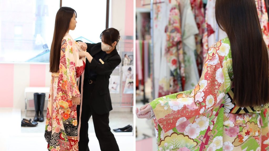 早めの振袖選び、試着するのは最近では珍しくありません。もっとも早い方は高校2年生から決める方もいらっしゃいます!