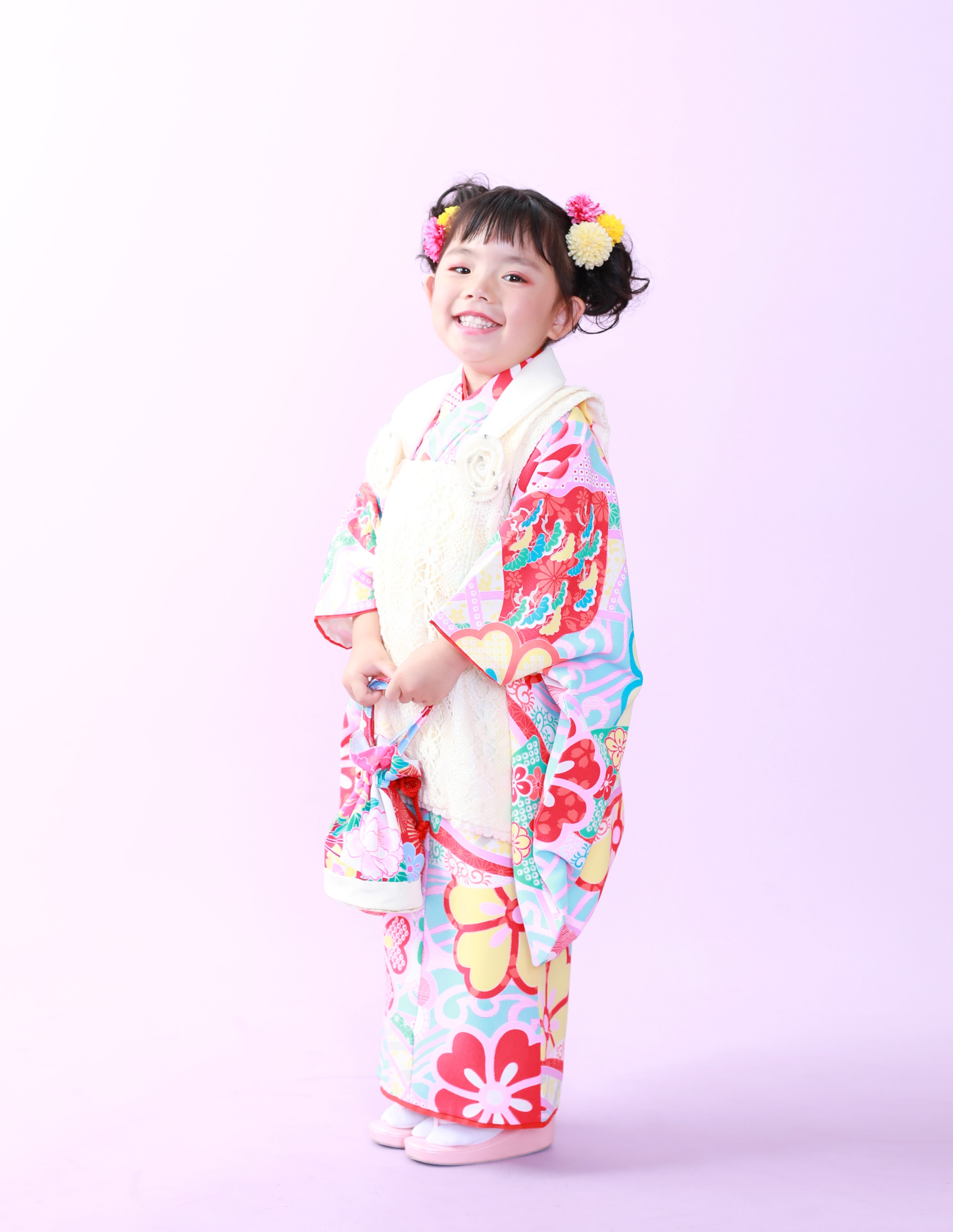 カラフルな着物の上に着る白レースの被布が今風でとってもおしゃれなこちらの着物。