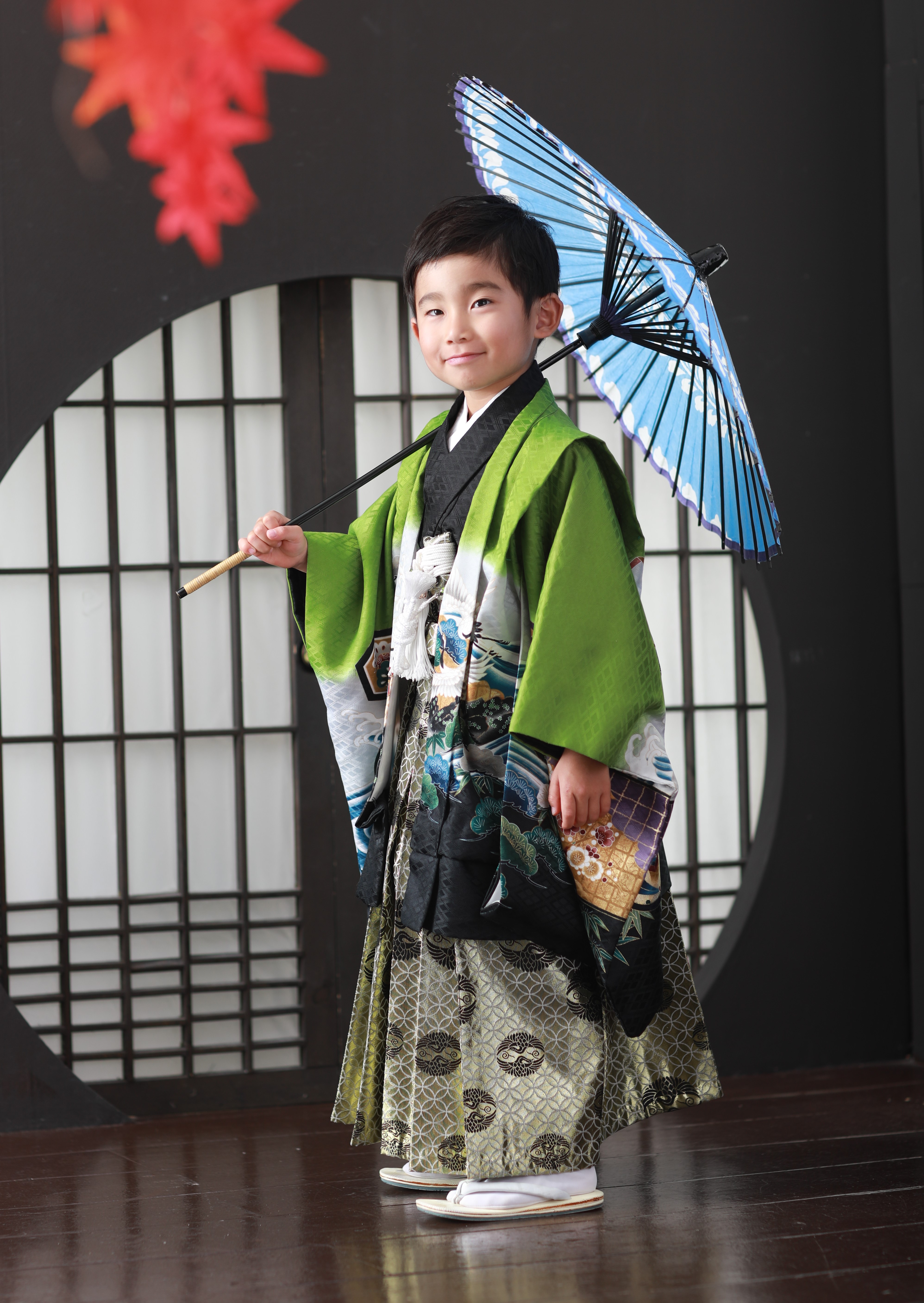 鮮やかな黄緑がぱっと目を引くこちらの着物は明るくはつらつとした五歳の男の子にぴったり。