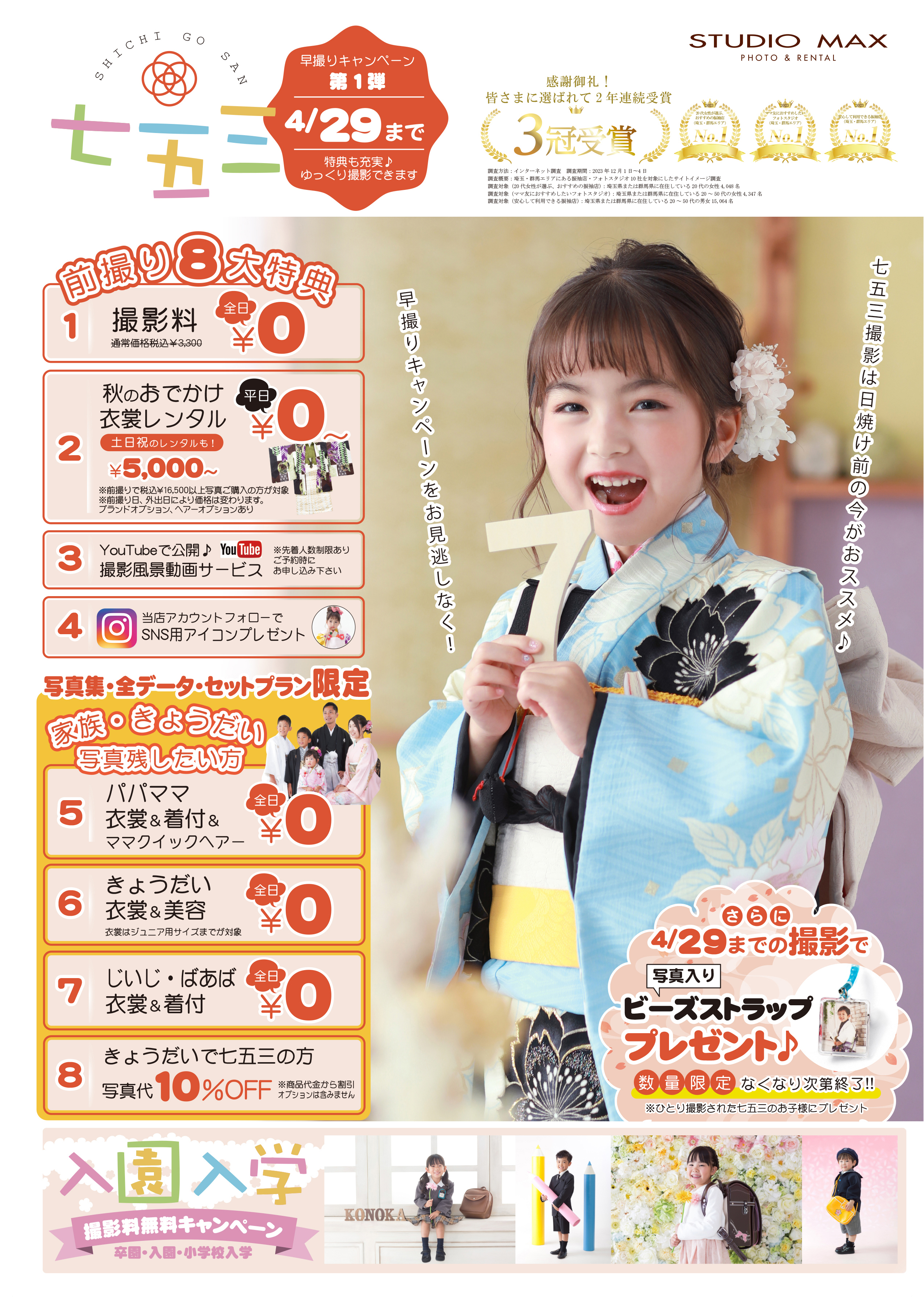 深谷店で開催中の4/29までの早撮り撮影でご利用いただける七五三前撮り撮影キャンペーンは