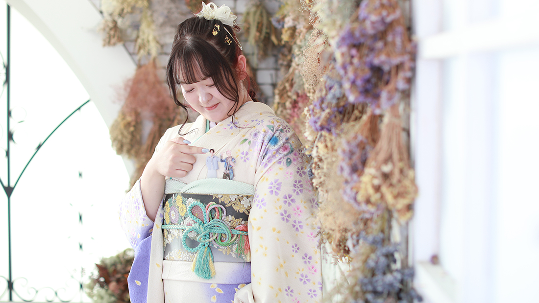淡い紫×白の華やかな振袖に身を包んだKOHAKUさん。