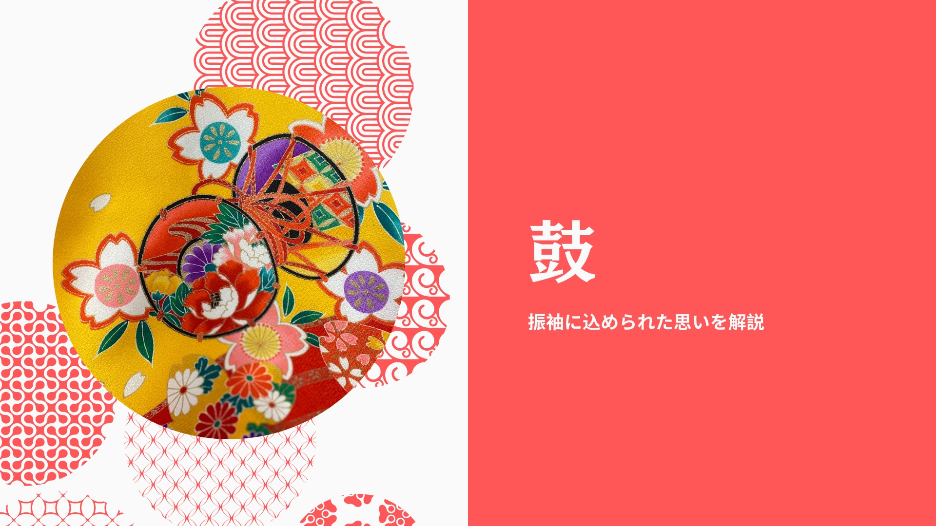 振袖の柄に描かれる「鼓(つづみ)」は、日本の伝統的な楽器であり、その歴史や意味から非常に縁起の良いモチーフ。