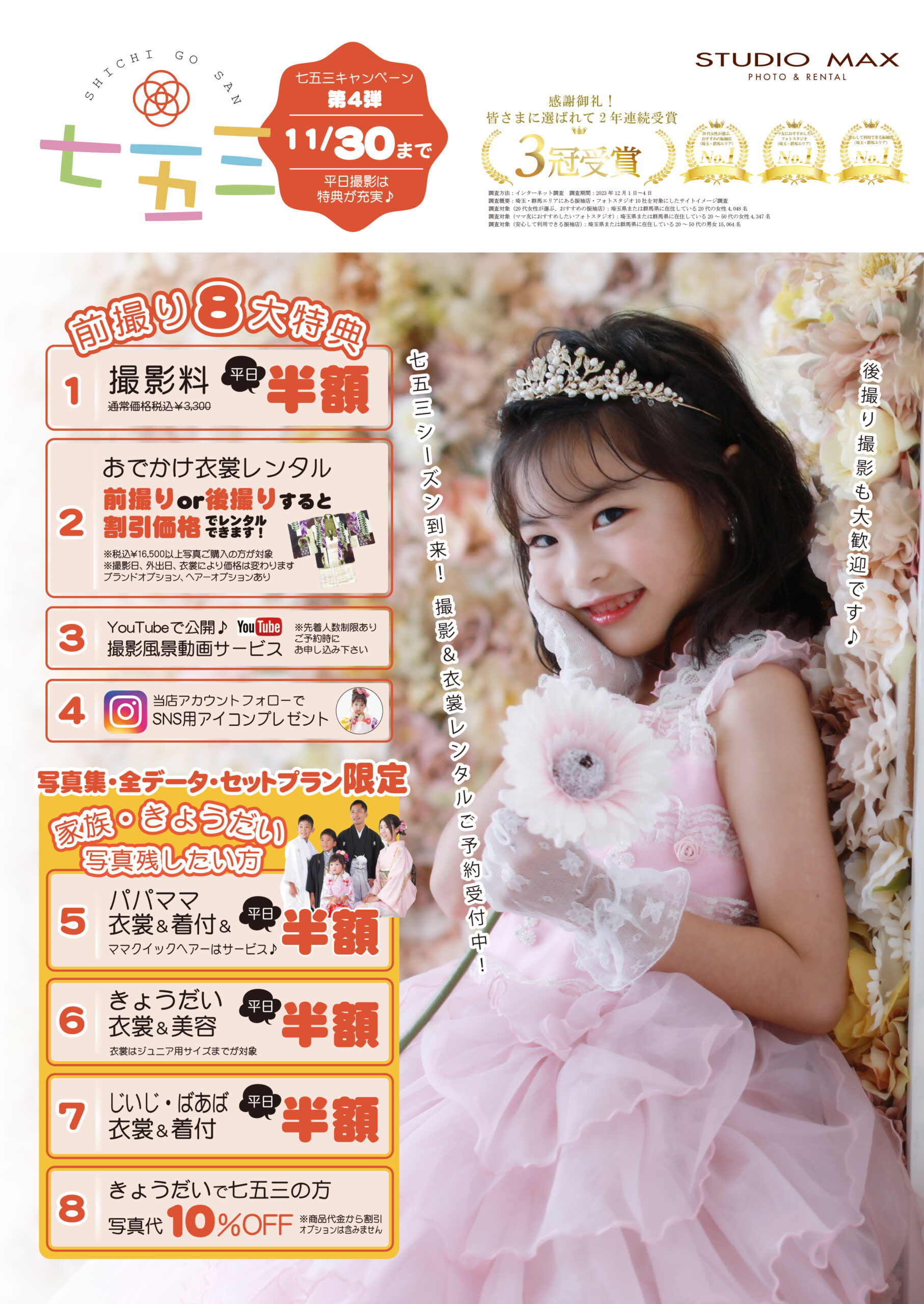 2025年七五三キャンペーン第4弾!!(^▽^)/キャンペーン内容は『撮影料平日半額』や『前撮りor後撮りで秋のお出かけ衣裳レンタル割引!』『当店のインスタアカウントのフォローでSNS用アイコ