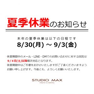 2021.8.30 スタッフブログ深谷店 ■深谷店■夏季休業期間について■ 最新のお知らせや情報は▷▶ココ◁◀をチェック! . . こんにちは、深谷店です★☆ . 本日よりスタジオマックス全店で 夏季休業に入ります!!! . お電話、メール、LINE、DMのご返信が 9月4日以降、順次対応となります? お返事まで少々お時間いただきます 🙁 ? . 大変申し訳ありませんがご理解お願いいたします。 9月4日はなるべく早く返信できるように頑張ります? . . では、お知らせでした! . . 各種お問合せ先はコチラをタップ? ?…■LINE■…? ?…■mail■…? ────────────────── 深谷店Instagram毎日更新中✨ check it now★ ────────────────── 振袖レンタルや七五三撮影、結婚写真の撮影ができる写真館を探している方、ぜひ埼玉県深谷市にある写真館スタジオマックス深谷店へお気軽にお問い合わせください。 【会社名】スタジオマックス深谷店 【郵便番号】〒366-0824 【住所】埼玉県深谷市西島町3-3-11 MAXビル1F~2F 【電話番号】048-571-0409 【HP】www.studiomax.jp ────────────────── 前の記事へ 一覧へ 次の記事へ