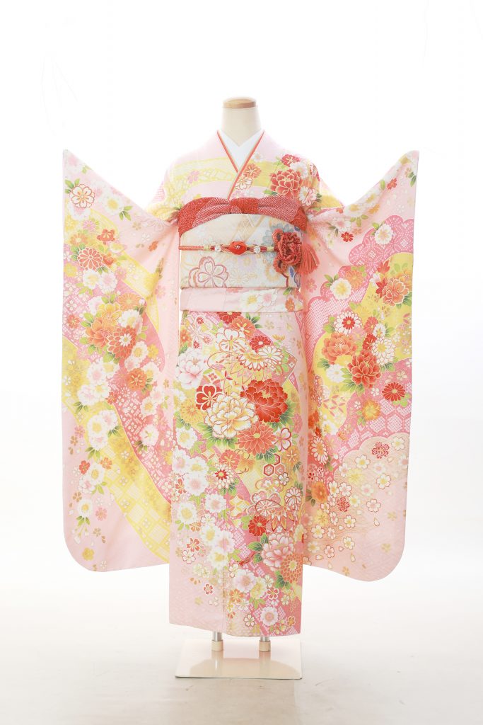 こちらのピンク色の振袖、牡丹や桜がたくさん散りばめられていてとってもかわいいです?