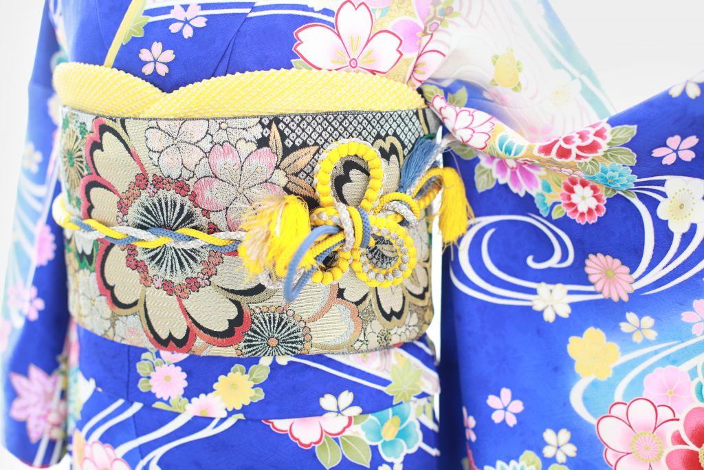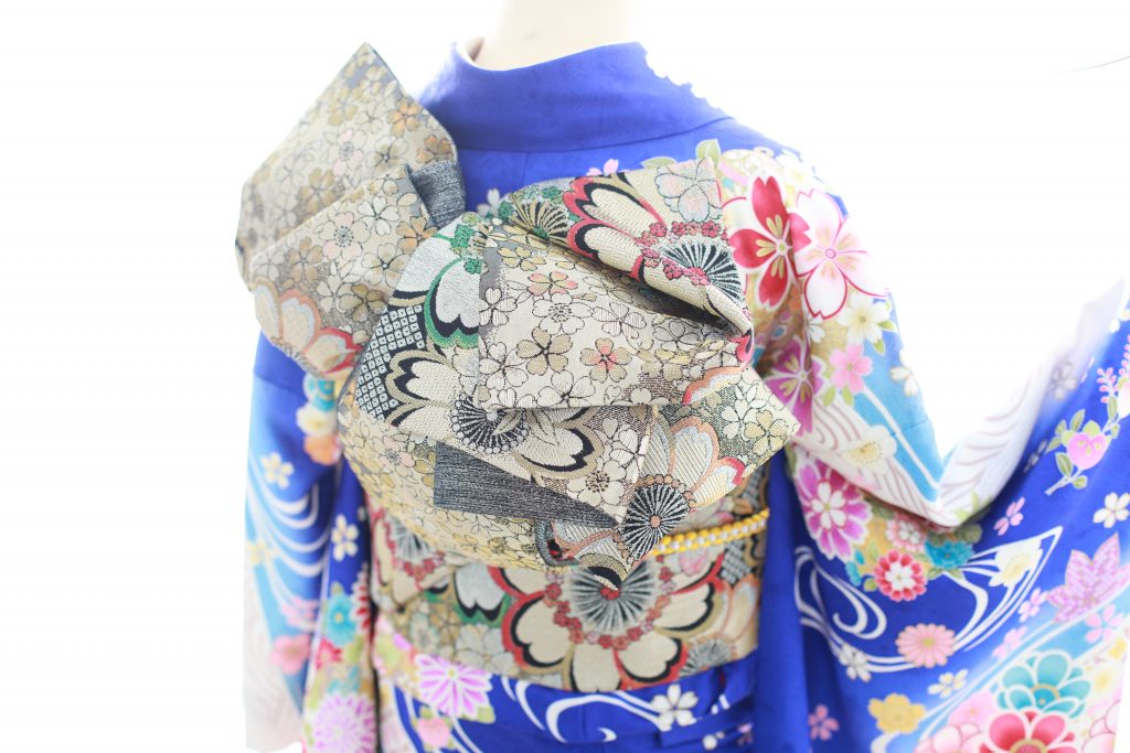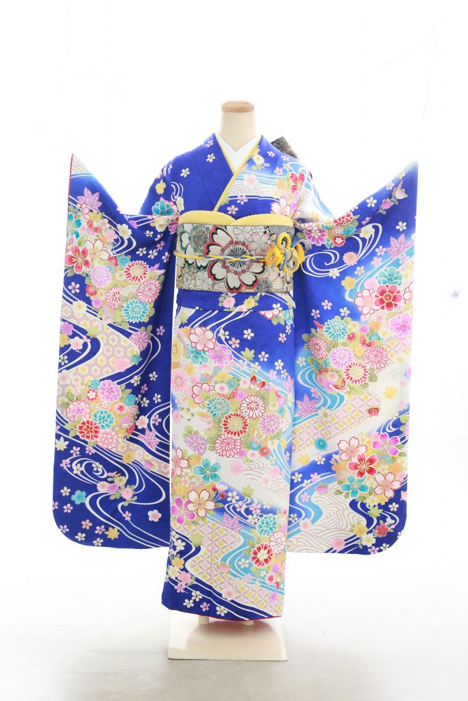 鮮やかな青の振袖です!色とりどりのお花が散りばめられていてかわいいですね?