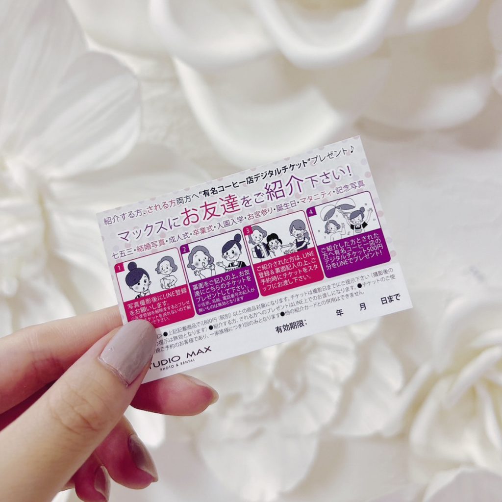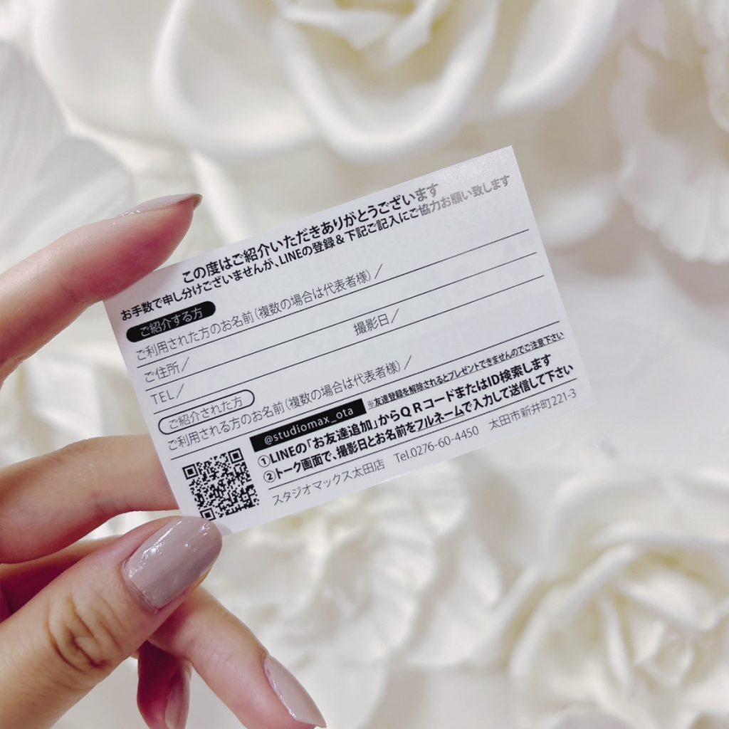 2023.7.27 スタッフブログ太田店 ☆太田店☆紹介キャンペーンのお知らせ こんにちは! スタジオマックス太田店です(^^)/ 本日は、当店で行っている紹介キャンペーンについてご紹介します!! お写真の受け渡し時にこちらのカードをお渡ししています! 当店を利用したことのないお友達を紹介して、その方が撮影してくれると… コーヒーショップのドリンクチケットプレゼント!! ぜひご活用ください? では、太田店でした? ーーーーーーーーーーーーーーーーーーーーー 各種お問い合わせ先はこちらをタップ↓↓ ★LINE★ ★メール★ 太田店インスタグラムはこちらから♡ ★Instagram★ ーーーーーーーーーーーーーーーーーーーーー 振袖レンタルや七五三撮影、結婚写真の撮影ができる写真館を探している方、ぜひ群馬県太田市にある写真館、スタジオマックス太田店へお気軽にお問い合わせください。 【会社名】スタジオマックス太田店 【郵便番号】〒373-0852 【住所】群馬県太田市新井町221-3 【電話番号】0276-60-4450 【HP】www.studiomax.jp 前の記事へ 一覧へ 次の記事へ
