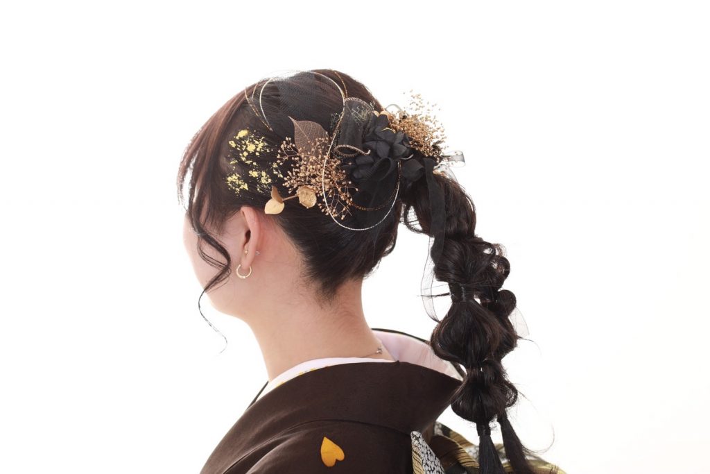 深い茶色の振袖に合わせてダークカラー&ゴールド系の飾りをチョイスされ