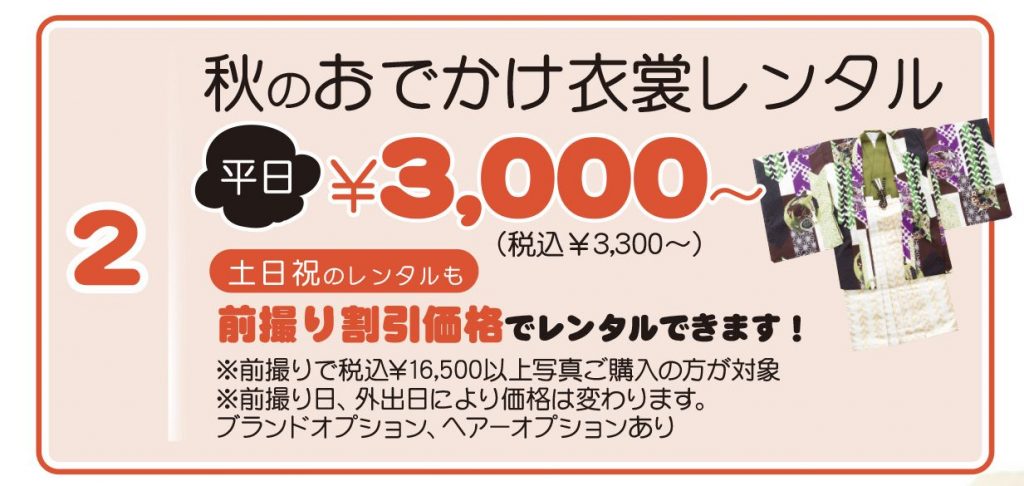 七五三シーズン前の前撮り特典になるので平日の前撮り撮影がおススメです。