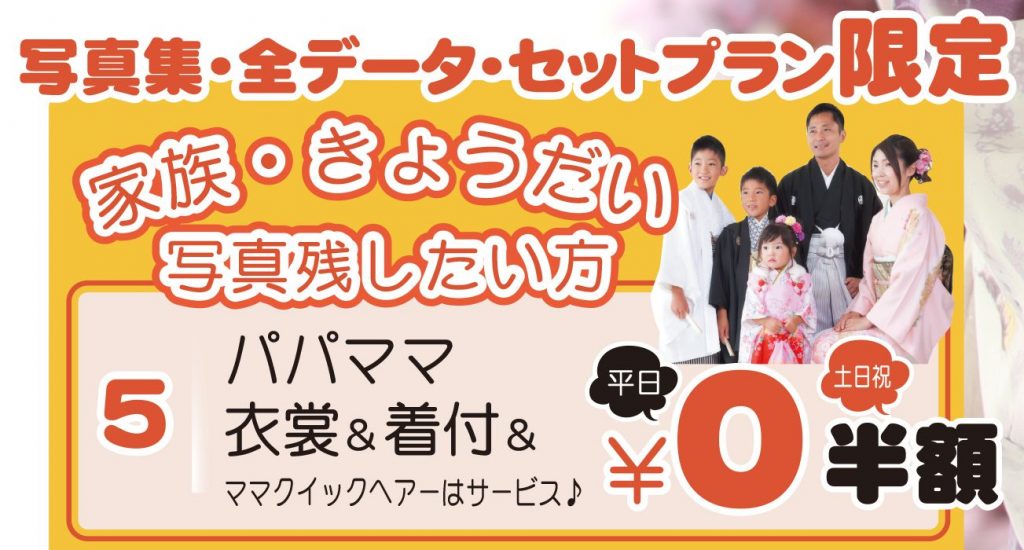 の三つのいずれかを選んでいただいた方限定で、せっかくの七五三でご家族写真も撮影したい方におススメです。