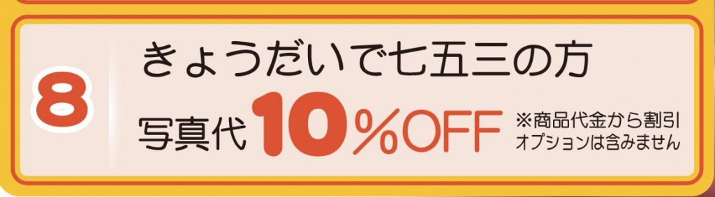 七歳&五歳などで同時に七五三をお迎えの方、前撮り写真代から10%引きになります。