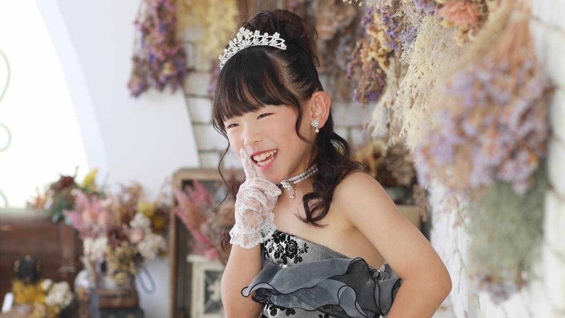 グレーベースのドレスは七歳の大人な雰囲気を綺麗に表現してくれるのでオススメです。