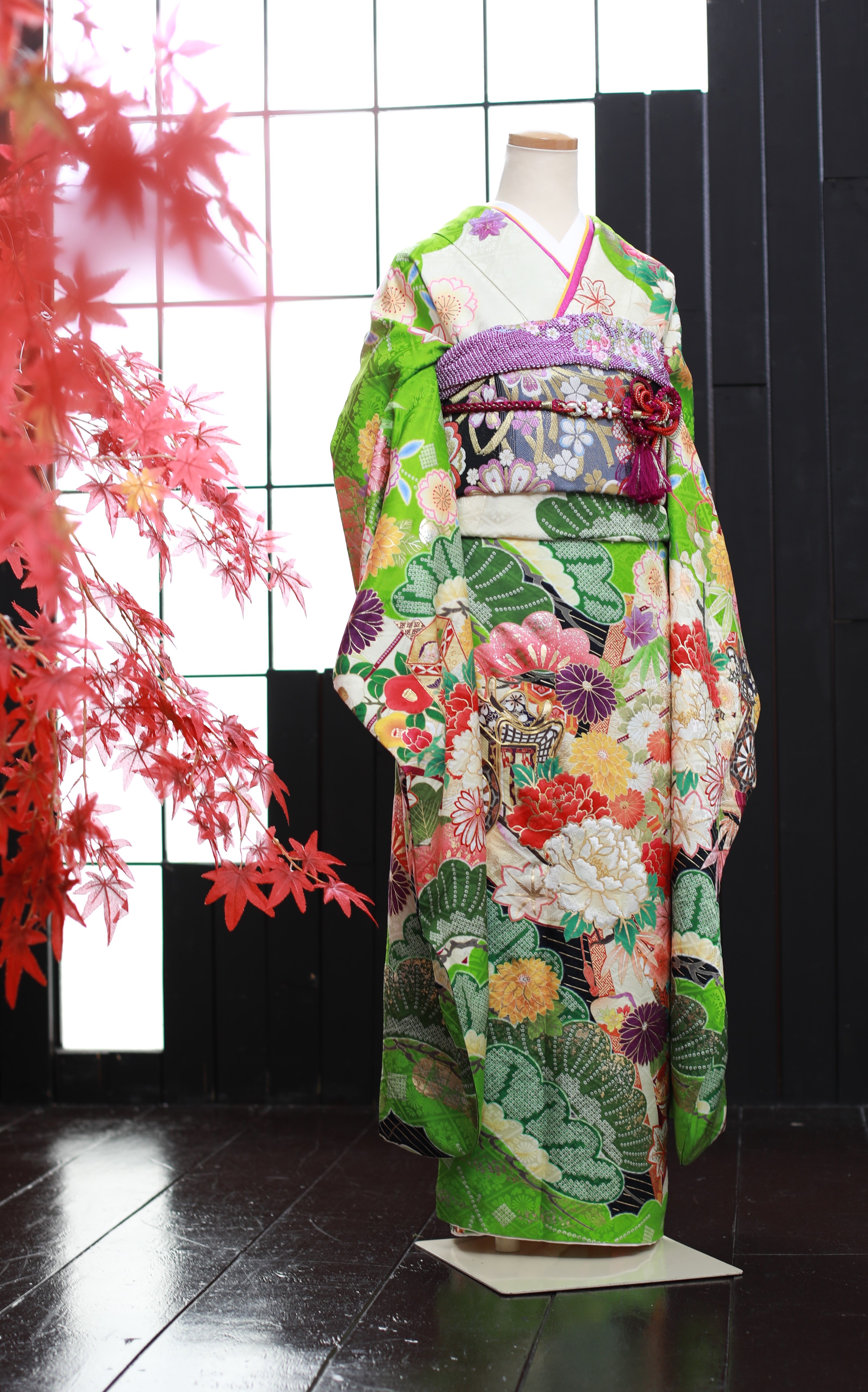 黄緑とクリームが上品な、成人式らしさ溢れる王道な振袖です。