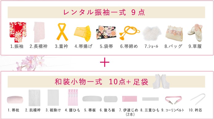 草履やバッグ・ショールまで含む9点のレンタル品にプラスで、和装小物10点・足袋は新品をプレゼントさせていただいております。