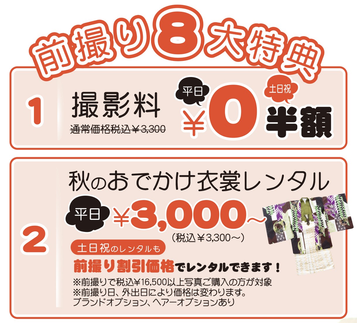 撮影料やご家族様の衣裳レンタル・お支度が無料になったり秋のお参り衣裳レンタルをお得にご利用いただけたり…七五三早撮り撮影キャンペーンを使って七五三前撮り撮影をすると特典がたくさん♡