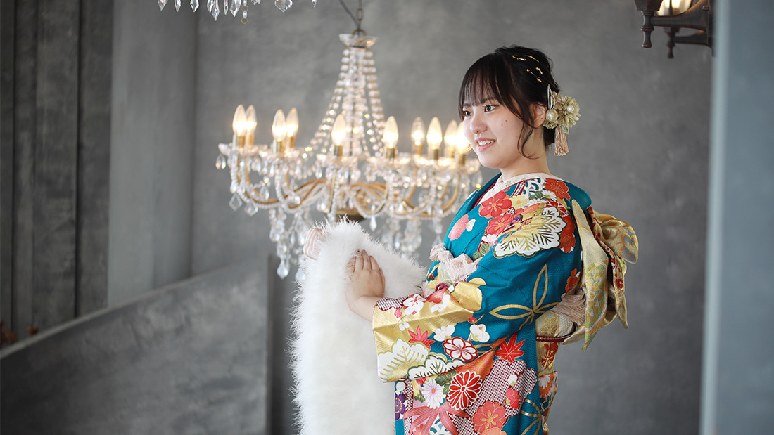 鮮やかなエメラルドグリーンのお振袖ではたちの記念写真を残してくれました!