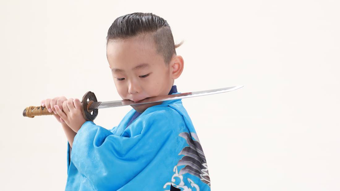 刀を咥えている水色の着物を着た五歳男の子