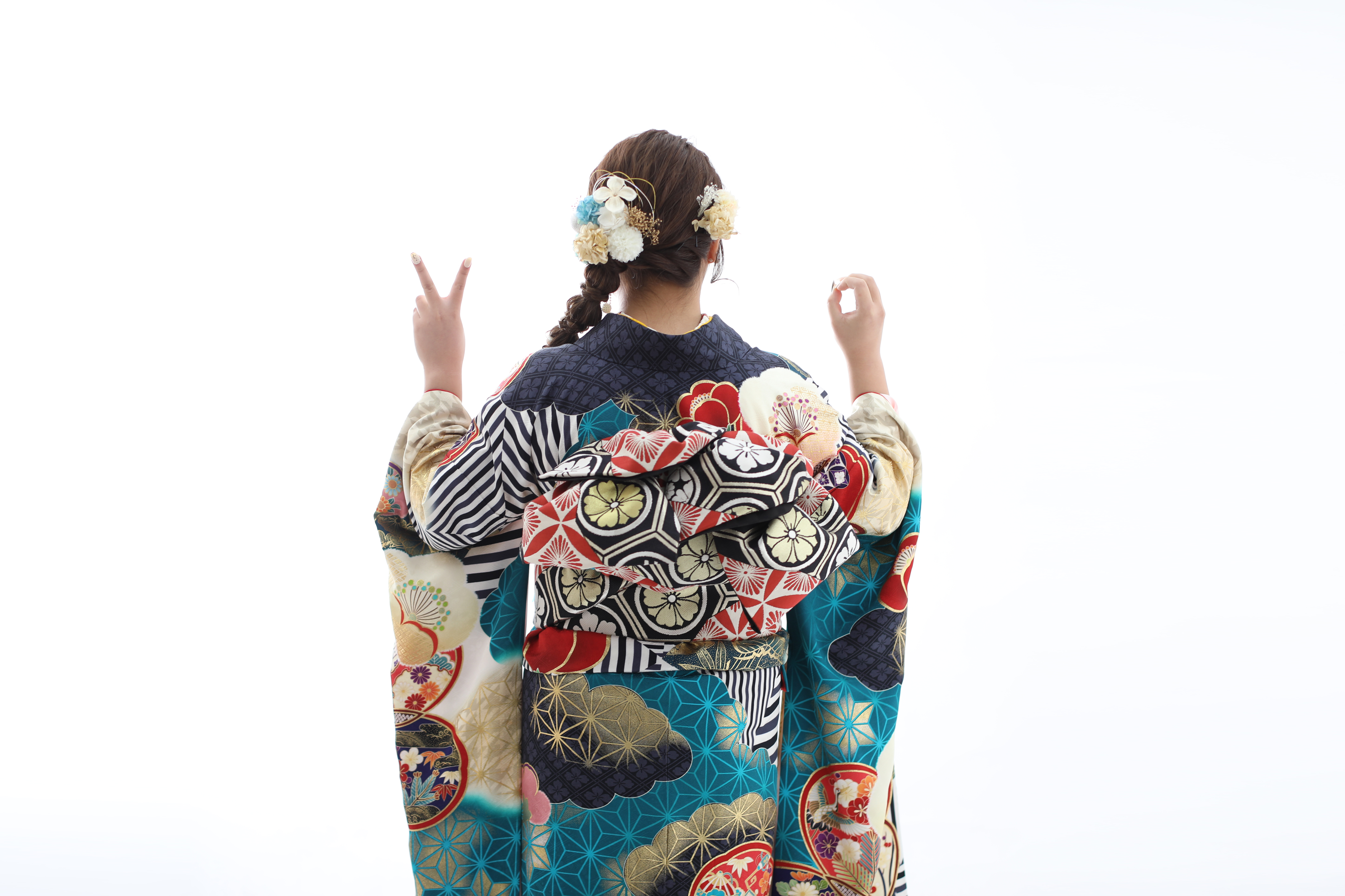 青色の振袖を着た二十歳女性の後姿こんにちは!スタジオマックス深谷店です。
