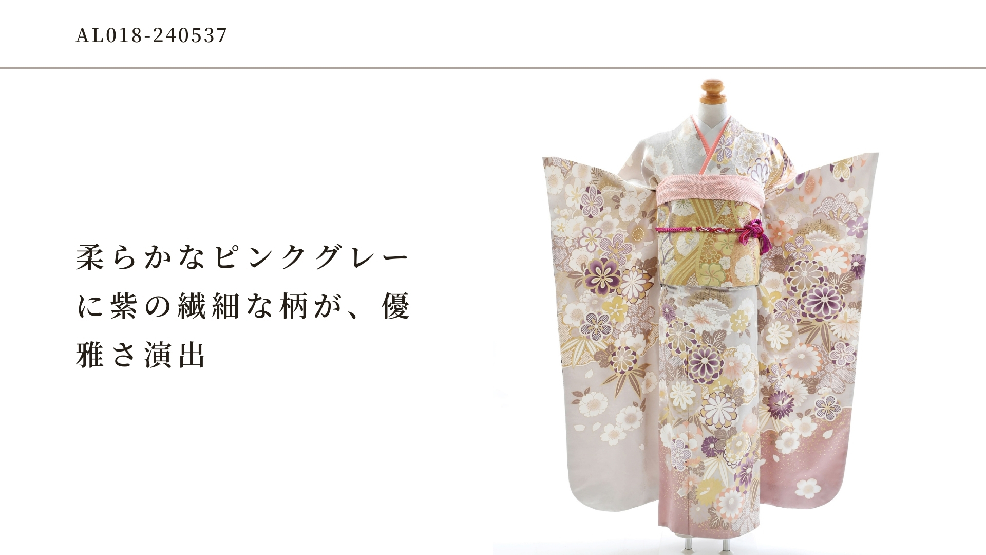 ラスト五着目はピンクグレーの可愛らしい色合いの振袖。