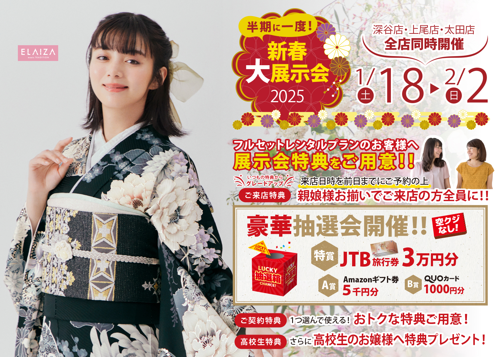 また新春振袖大展示会限定のお得に振袖レンタルができる割引特典や、高校生限定特典もご用意しておりますので振袖選びがまだの方はぜひあなただけの運命の一着を上尾店で見つけてくださいね。
