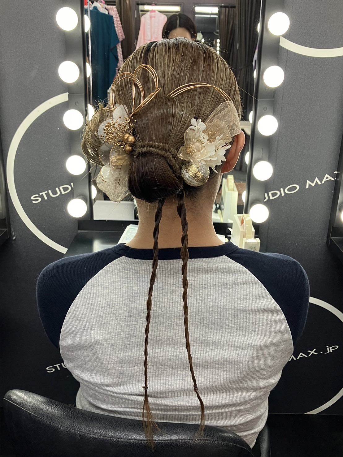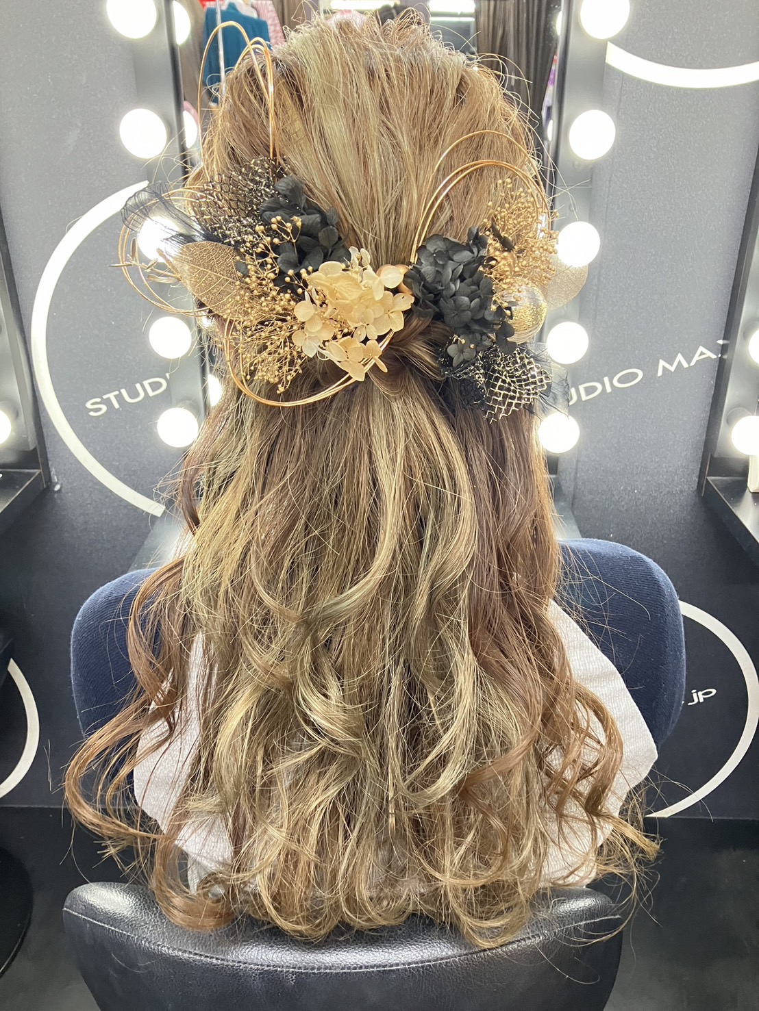 バックにまとめて付けるのが定番ですが、前から見たときに髪飾りもよく見せたい方はサイドに付けてもOK。