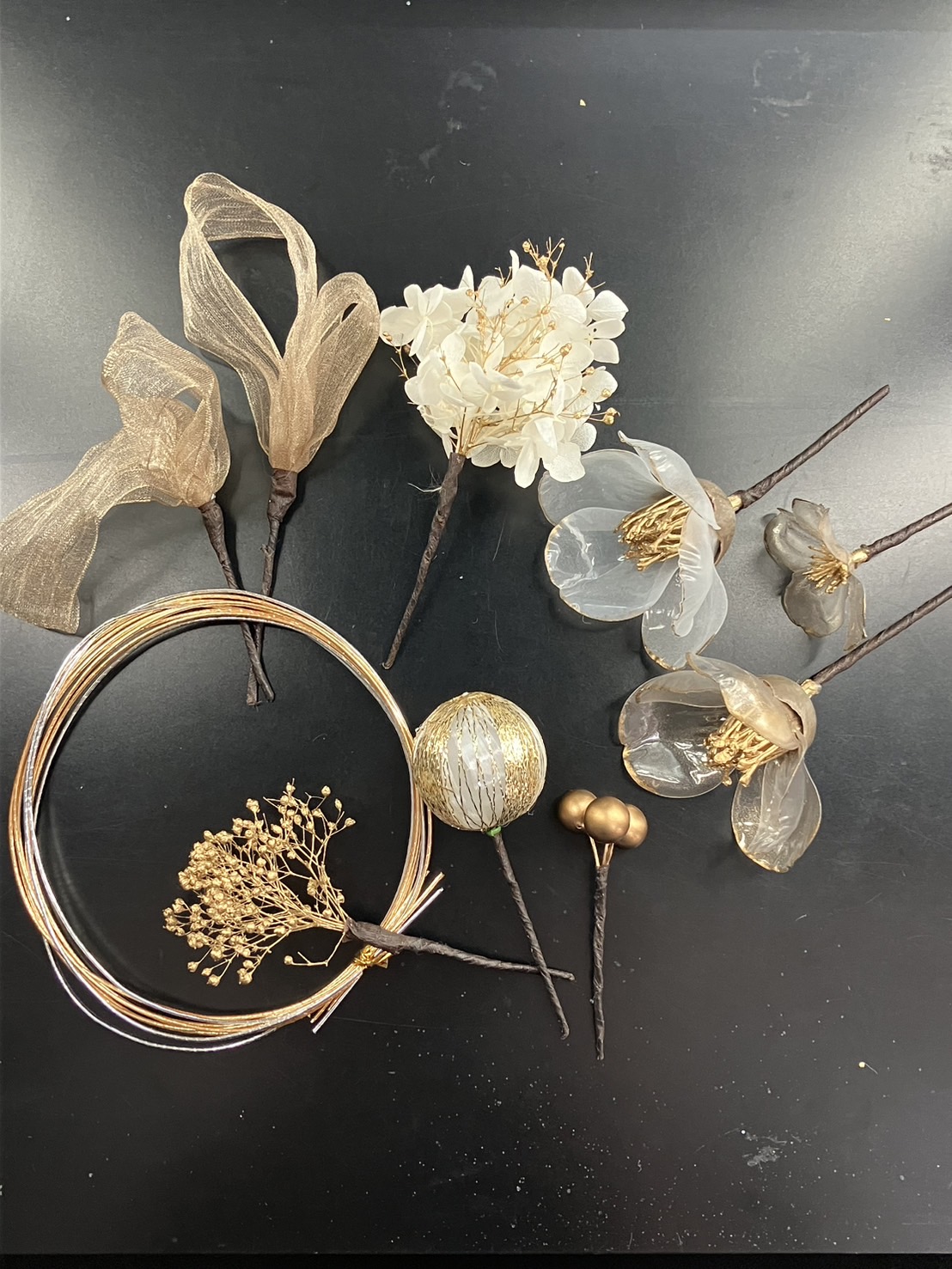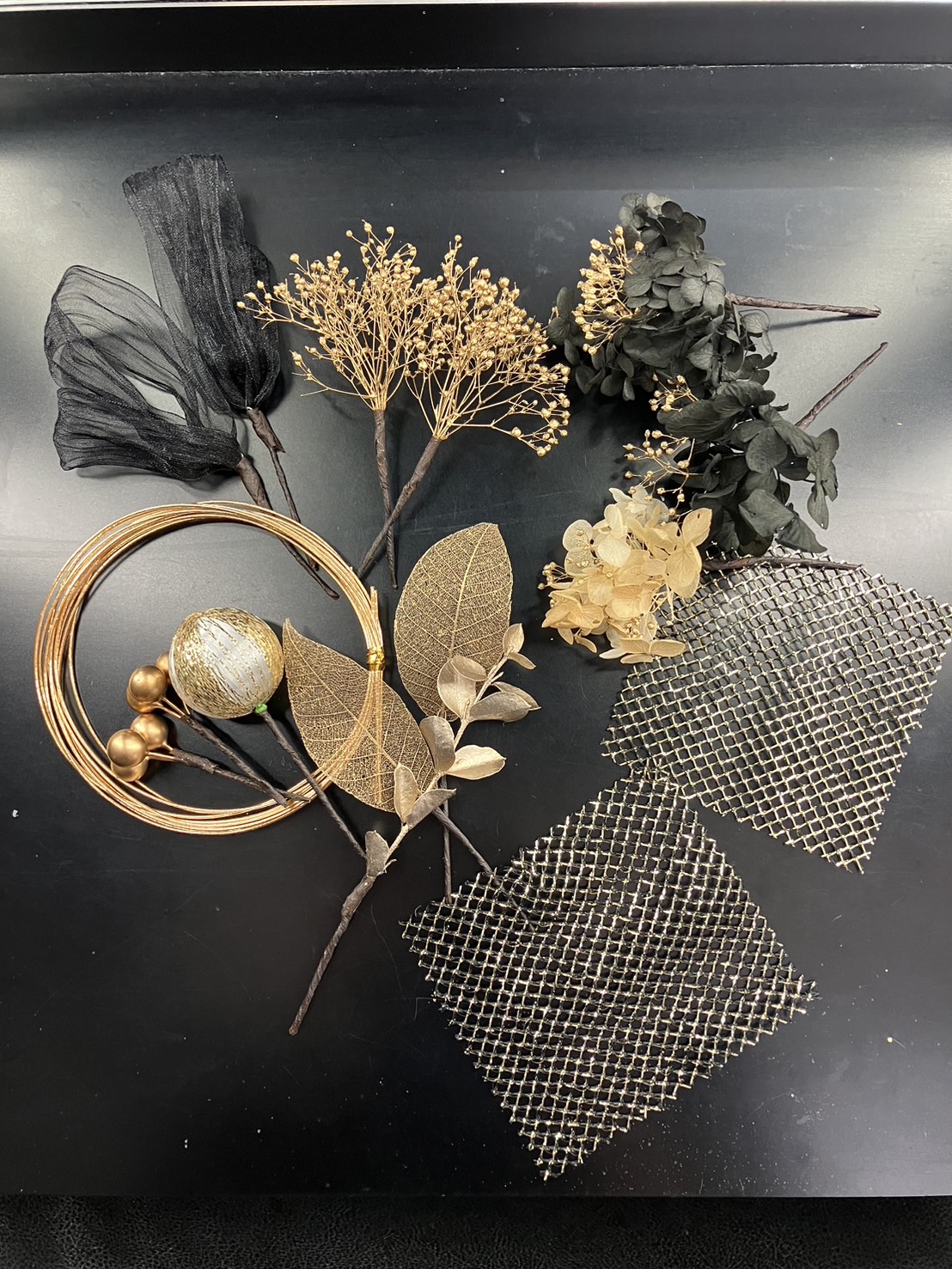ドライフラワーだけでなく水引やパール、リボンやキラキラのネットなど計16パーツのセットです。