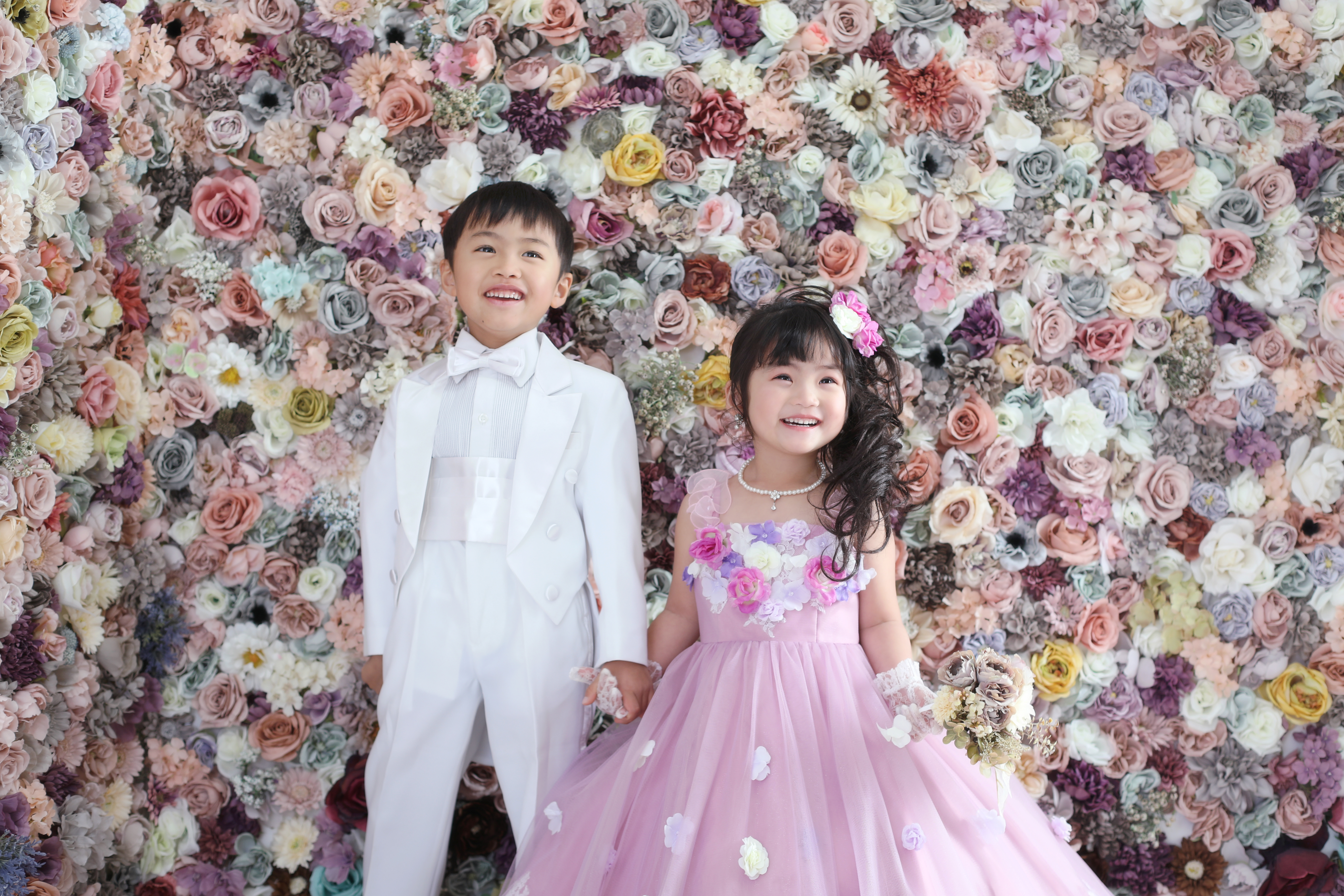 白のタキシードを着た5歳の兄とピンクのドレスを着た3歳の妹の写真こんにちは!スタジオマックス深谷店です。