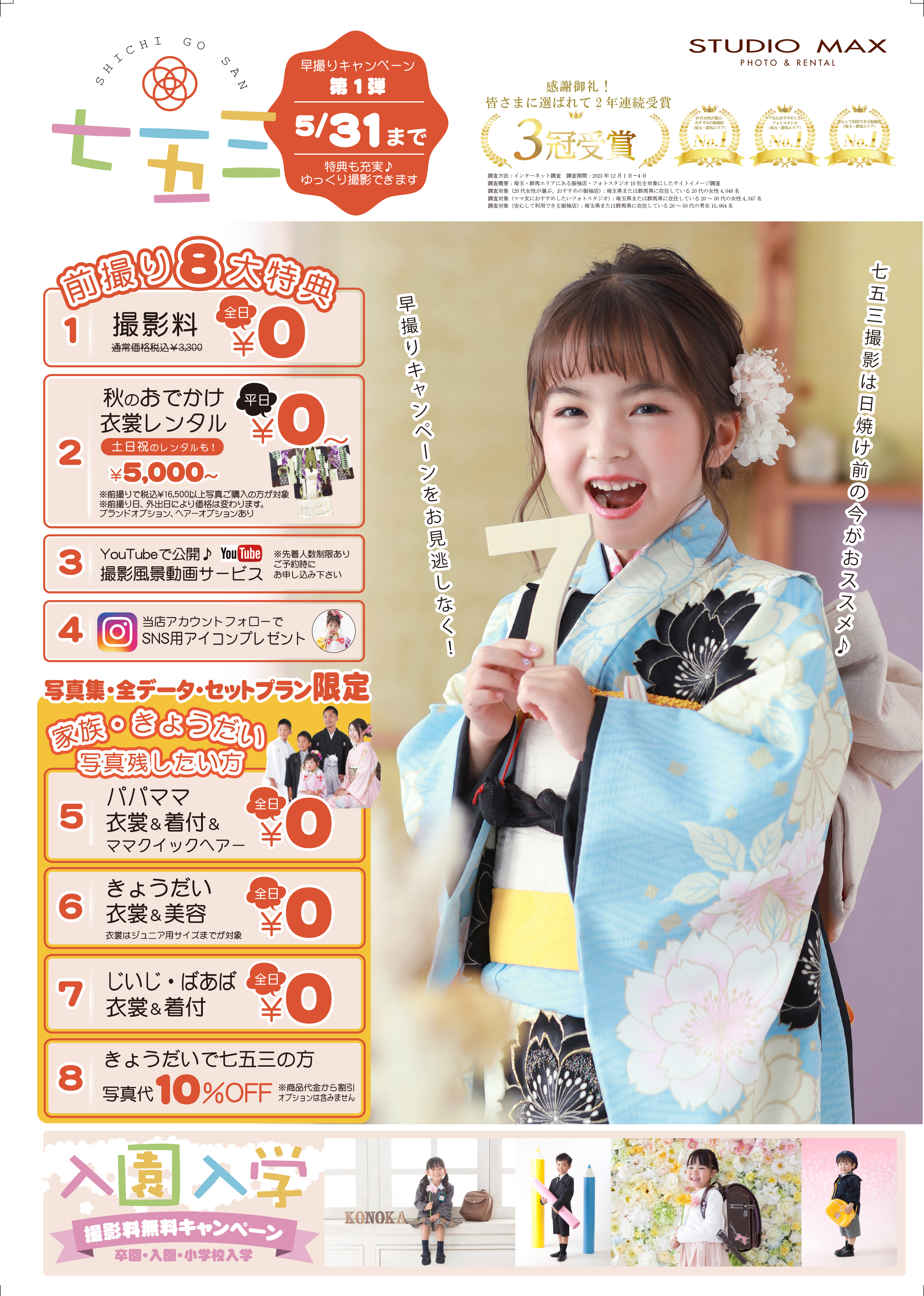 お得に七五三前撮り撮影ができる早撮りキャンペーンは5/31まで☆