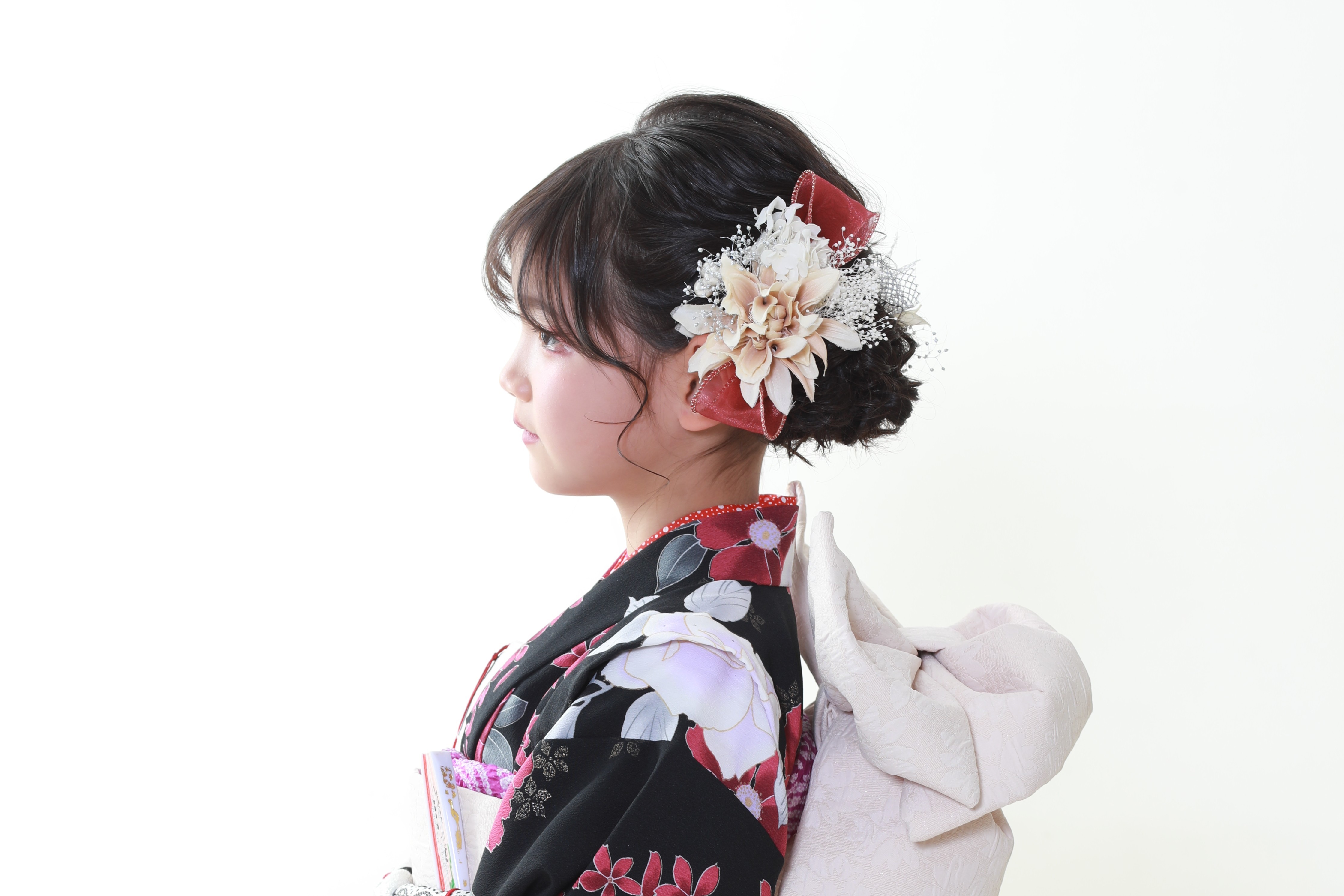 今っぽいポップな着物にも、落ち着いた古典柄の着物にも似合う幅広いヘアアレンジができるのが魅力のひとつ。