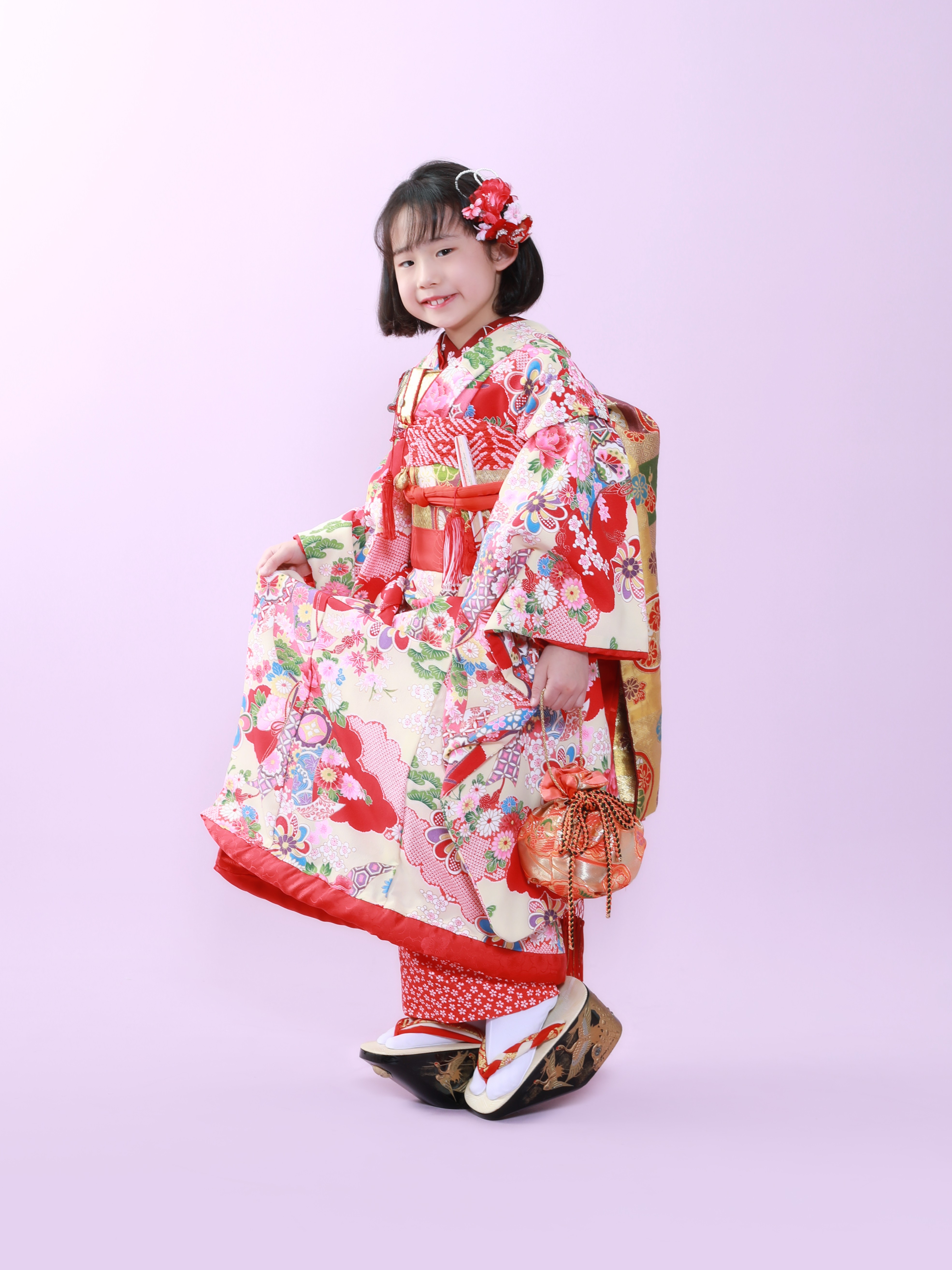 ひとつはクリーム色に色とりどりの柄があしらわれた明るく華やかな舞妓着物。 七歳の可愛らしさを引き立てる優しくて愛らしい印象が魅力です。