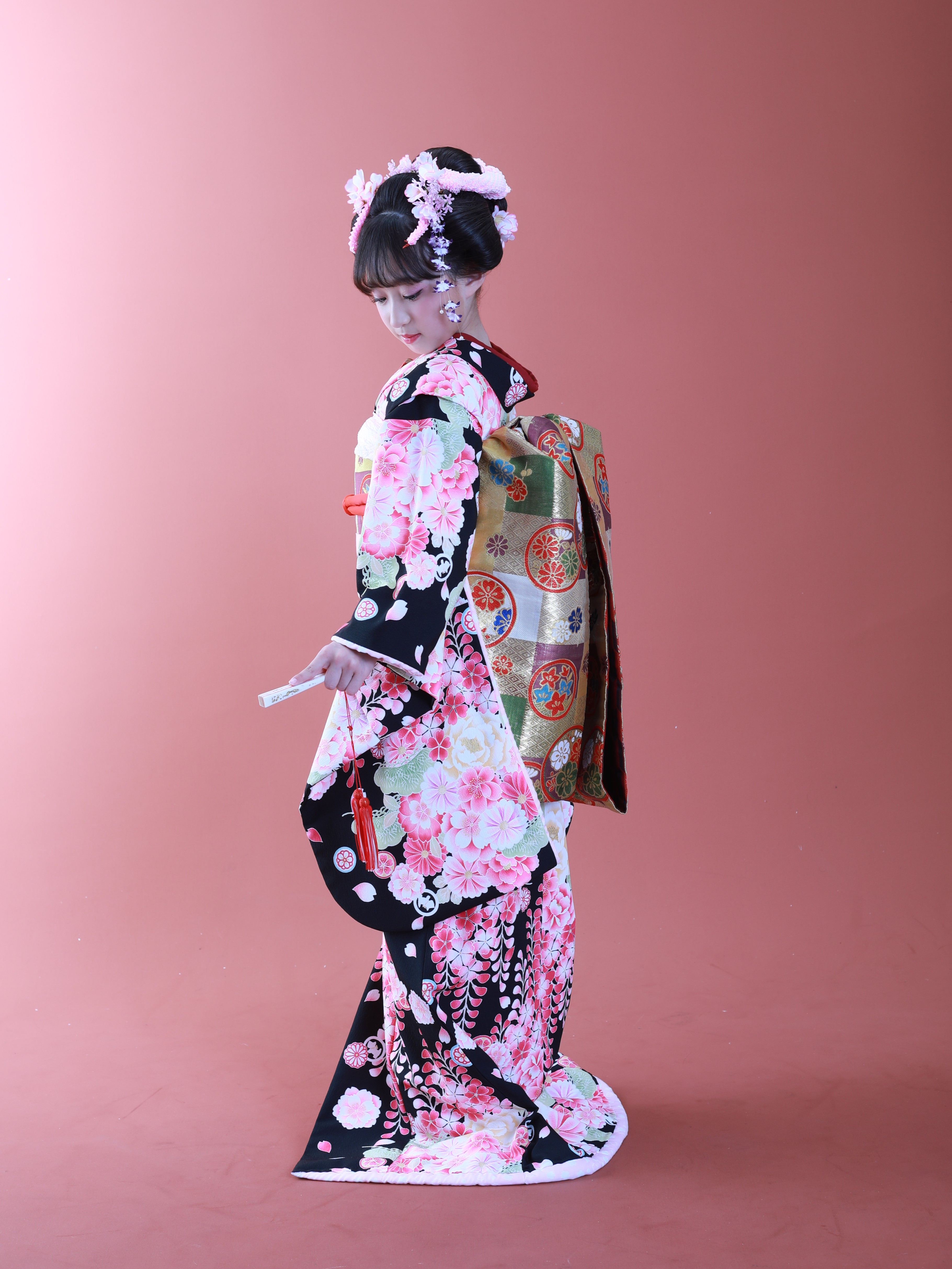 もうひとつは黒地に藤の花が咲くしっとりとした大人っぽい舞妓着物。 落ち着いた中にも気品があり、「背伸びしたいお年ごろ」にぴったりの一着です。