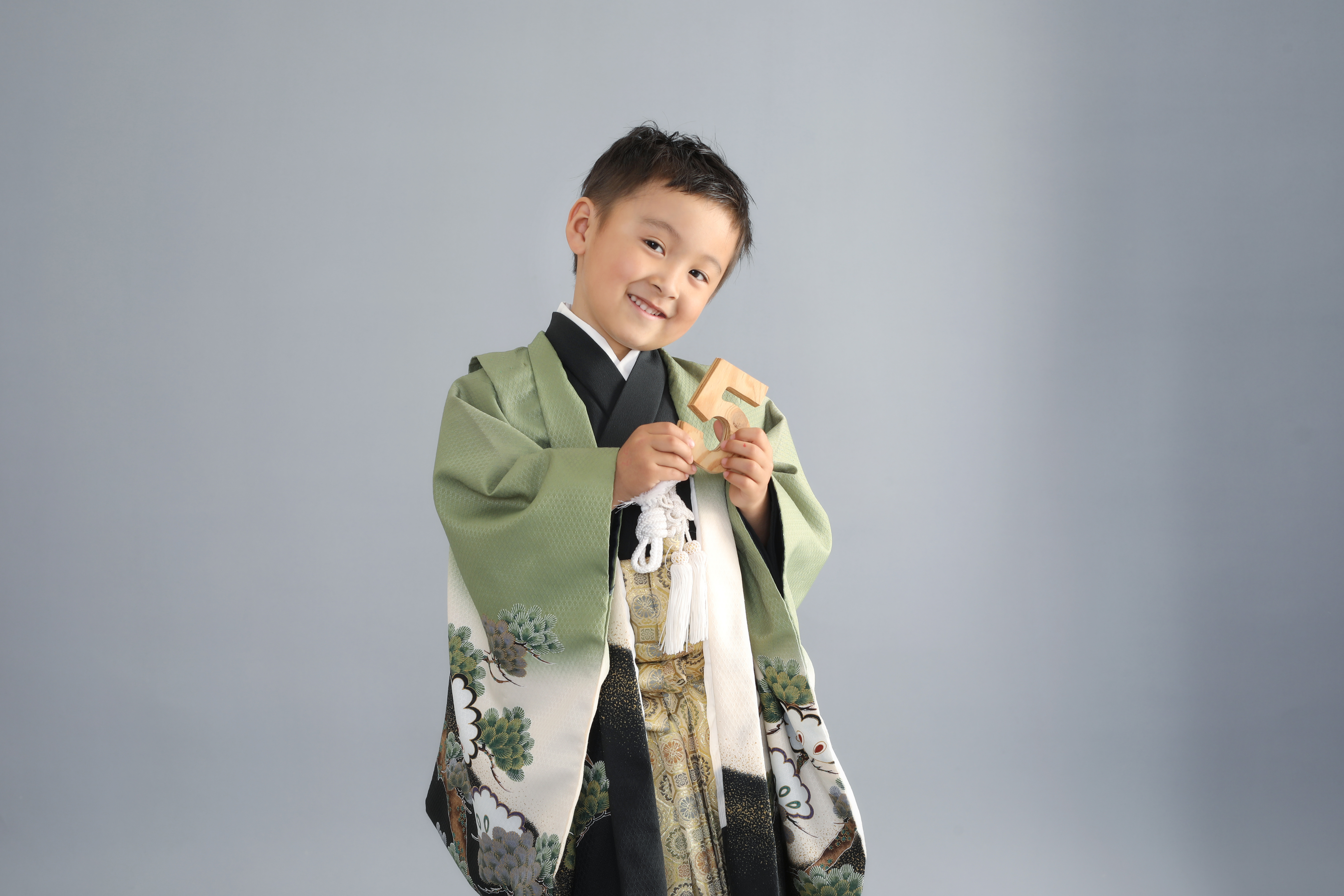 数字の5を持っている緑着物を着た5歳の男の子の着物こんにちは!スタジオマックス深谷店です。