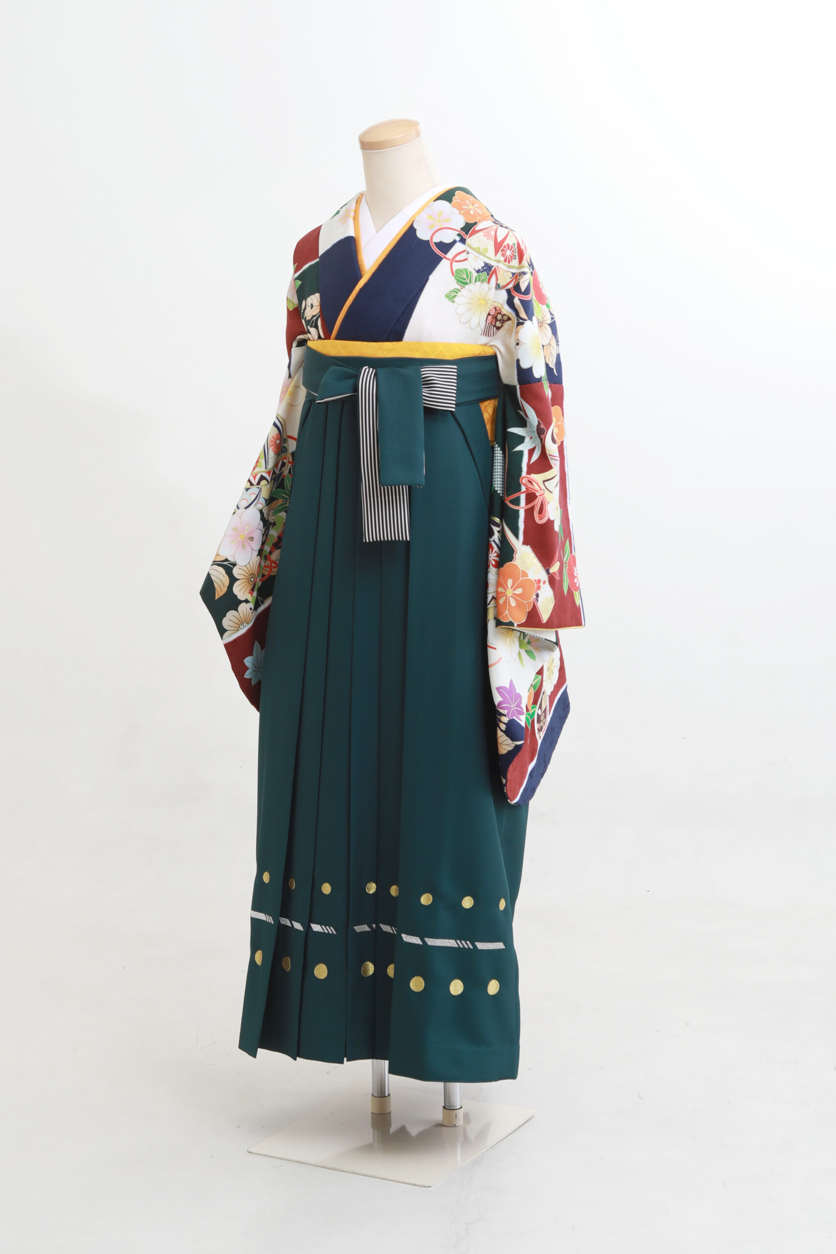 紺・緑・エンジ・白などのメリハリある配色に、カラフルな古典柄が華やかに入り卒業式らしい特別感のある装いに仕上がっています。