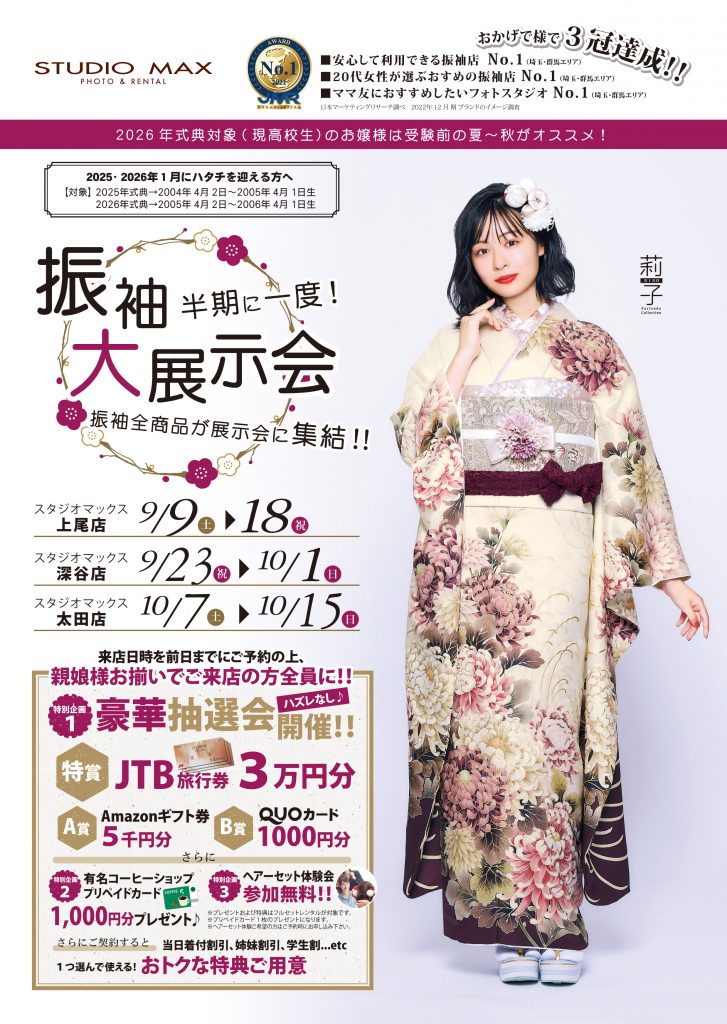 2023.8.21 スタッフブログYoutube深谷店成人式 ■深谷店■振袖大展示会のご紹介■ 最新のお知らせや情報は▷▷ココ◁◁をチェック! こんにちは、深谷店です☺ ★★振袖大展示会のお知らせ★★ 秋の大展示会の日程が決まりました!!!!! 深谷店は 9月23日~10月1日 来場するだけでお得な特典つき♥ 是非、ご予約ください★ スタジオマックス全店では、 平日限定でお得な料金で撮影できる ブライダルフォトプランをご提案中(*´ω`*) お写真一枚からお買い求めOK! ヘアメイクや着付け、衣装込々の料金なので お得に撮影できちゃいます★ ※一部衣装はブランドOP有 新婚さん プレ花嫁さん 結婚式の前撮り 銀婚式 金婚式 周年記念 などなど… 色々なカップル&御夫婦でご利用いただけます♥ 是非、ご検討くださいませ~~~☺ 深谷店でした★ 各種お問合せ先はコチラをタップ? ?…■LINE■…? ?…■mail■…? ────────────────── 深谷店Instagram毎日更新中✨ check it now★ ────────────────── 振袖レンタルや七五三撮影、結婚写真の撮影ができる写真館を探している方、ぜひ埼玉県深谷市にある写真館スタジオマックス深谷店へお気軽にお問い合わせください。 【会社名】スタジオマックス深谷店 【郵便番号】〒366-0824 【住所】埼玉県深谷市西島町3-3-11 MAXビル1F~2F 【電話番号】048-571-0409 【HP】www.studiomax.jp ────────────────── 前の記事へ 一覧へ 次の記事へ