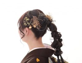 深い茶色の振袖に合わせてダークカラー&ゴールド系の飾りをチョイスされ