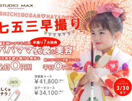 こんにちは、深谷店です☺ 深谷店では七五三の早撮りキャンペーンがスタートしてます◎ 今だけのお得なキャンペーンも実施中✨ きょうだい(120㎝まで)も無料で着付け&美容✨ 家族みんなで着物を着て撮影ができます? オシャレなタキシードもあります❁ この機会にぜひお急ぎください? ご見学だけのご来店も受付中です? 只今、完全予約制とさせて頂いておりますので、 見学のご希望日がございましたら事前に お電話かLINE、メールにてお問い合わせください☺ 気になる事ご不安な事ありましたらお気軽にお問い合わせください? ご試着もできますので ぜひぜひ、店頭に聞きに来てくださいね♪ ご予約お問合せお待ちしております? 深谷店Instagram毎日更新中✨ https://www.instagram.com/studiomax.fukaya_official 振袖レンタルや七五三撮影、結婚写真の撮影ができる写真館を探している方、ぜひ埼玉県深谷市にある写真館スタジオマックス深谷店へお気軽にお問い合わせください。 【会社名】スタジオマックス深谷店 【郵便番号】〒366-0824 【住所】埼玉県深谷市西島町3-3-11 MAXビル1F~2F 【電話番号】048-571-0409 【HP】www.studiomax.jp