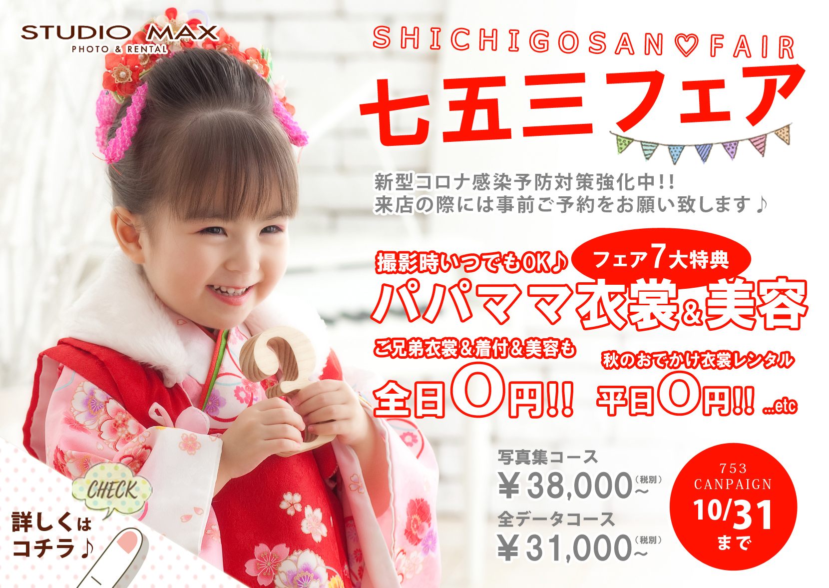 2020.9.30 お知らせ 深谷店 キャンペーン 上尾店 太田店 おすすめ情報 店鋪 【10月31日まで】七五三早撮りキャンペーン延長決定‼ 9月はたくさんのお客様にご来場いただきありがとうございます。 またマスク着用やアルコール消毒などコロナ対策のご協力もありがとうございます。 スタジオマックスでは毎年恒例の七五三早撮りキャンペーンを10月31日(土)まで延長することとなりました(^▽^)/ キャンペーン内容は『パパママ衣装着付無料』や『お出かけ衣裳平日レンタル0円』『待受画像プレゼント!』など!他にも盛りだくさん♪ フェア内容についてはお気軽にお問い合わせ下さい! 弊社ホームページにも掲載中(^^♪ 前の記事へ 一覧へ 次の記事へ