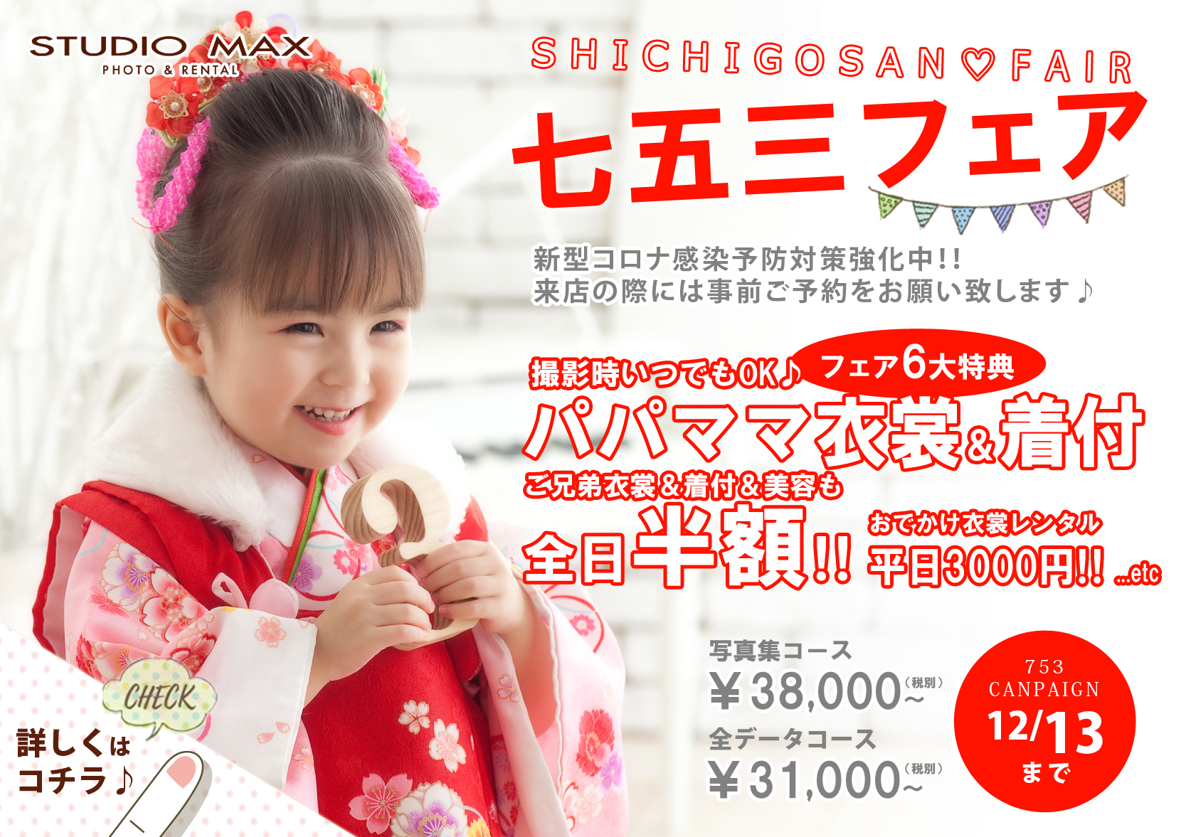 2020.10.28 お知らせ 深谷店 キャンペーン 上尾店 太田店 おすすめ情報 店鋪 【12月13日まで】七五三早撮りキャンペーン開催‼ 11月はたくさんのお客様にご来場いただきありがとうございます。 またマスク着用やアルコール消毒などコロナ対策のご協力もありがとうございます。 スタジオマックスでは毎年恒例の七五三早撮りキャンペーンを12月13日(日)まで開催します(^▽^)/ キャンペーン内容は『パパママ衣装着付半額』や『お出かけ衣裳平日レンタル3,000円』『待受画像プレゼント!』など!他にも盛りだくさん♪ フェア内容についてはお気軽にお問い合わせ下さい! 弊社ホームページにも掲載中(^^♪ 前の記事へ 一覧へ 次の記事へ