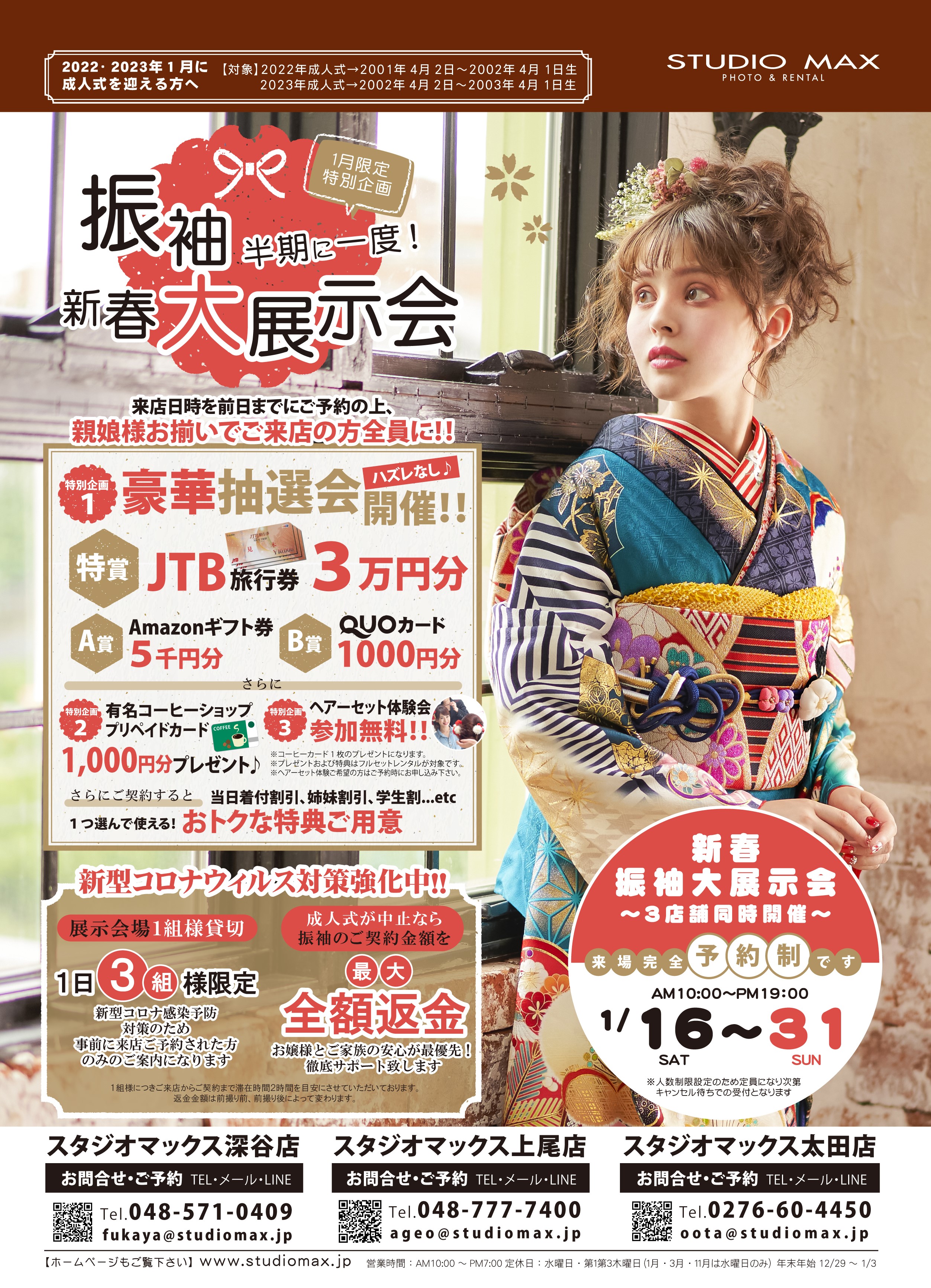 2020.12.13 お知らせ 深谷店 キャンペーン 上尾店 太田店 おすすめ情報 店鋪 【1/16~1/31】半期に1度の新春振袖大展示会開催!! お問合せ・ご予約はこちら 前の記事へ 一覧へ 次の記事へ