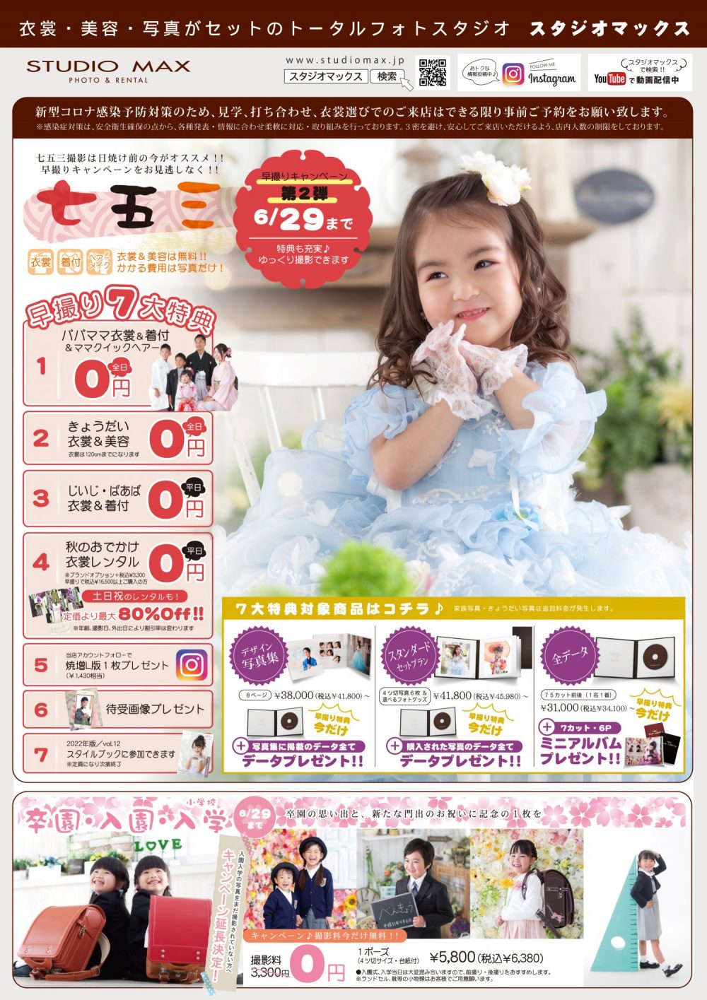 2021.7.29 お知らせ 深谷店 キャンペーン 上尾店 太田店 おすすめ情報 店鋪 七五三早撮りキャンペーン開催中♪ スタジオマックス恒例の七五三早撮りキャンペーン第一弾がスタートしました(^▽^)/ キャンペーン内容は『パパママ衣装着付無料』や『お出かけ衣裳平日レンタル0円』『待受画像プレゼント!』など! 他にも盛りだくさん♪ キャンペーン期限は8月29日まで♪ フェア内容についてはお気軽にお問い合わせ下さい! 弊社ホームページにも掲載中(^^♪ 前の記事へ 一覧へ 次の記事へ