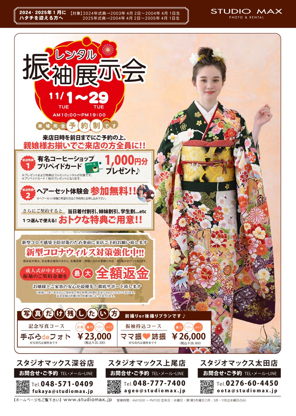2022.10.30 お知らせ 深谷店 キャンペーン 上尾店 太田店 おすすめ情報 店鋪 11月29日まで振袖展示会開催♪振袖のことならお任せ!! 11月29日まで全店で振袖展示会を開催しています♪ 新柄のお着物もたくさんご用意しております♪ お好みの色、お好みの柄で一生に一度の成人式を着飾りましょう(^^♪ 是非この機会に一度お店にお越しください(*´ω`*) ☆事前に展示会へ来場予約をしていただた方全員に、有名コーヒーショップで使える1,000円分カードをプレゼント♬ お問合せ・ご予約はこちら 前の記事へ 一覧へ 次の記事へ