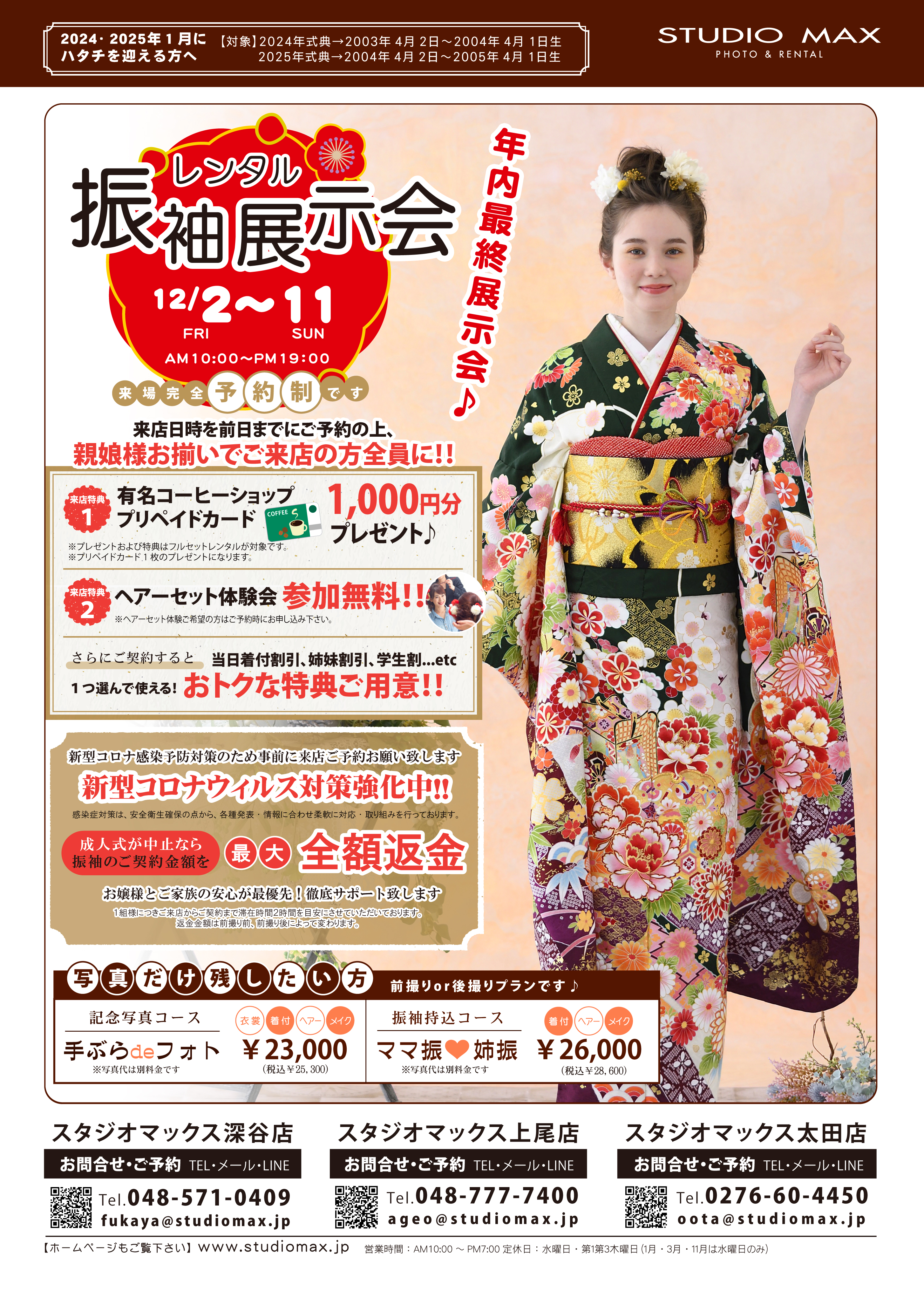 2022.12.5 お知らせ 深谷店 キャンペーン 上尾店 太田店 おすすめ情報 店鋪 来年成人式の方!振袖を用意していない方!まだ間に合います♪ 来年成人式を迎える方必見! 12月11日まで全店で振袖展示会を開催しています♪ 新柄のお着物もたくさんご用意しております♪ お好みの色、お好みの柄で一生に一度の成人式を着飾りましょう(^^♪ 是非この機会に一度お店にお越しください(*´ω`*) ☆事前に展示会へ来場予約をしていただた方全員に、有名コーヒーショップで使える1,000円分カードをプレゼント♬ お問合せ・ご予約はこちら 前の記事へ 一覧へ 次の記事へ