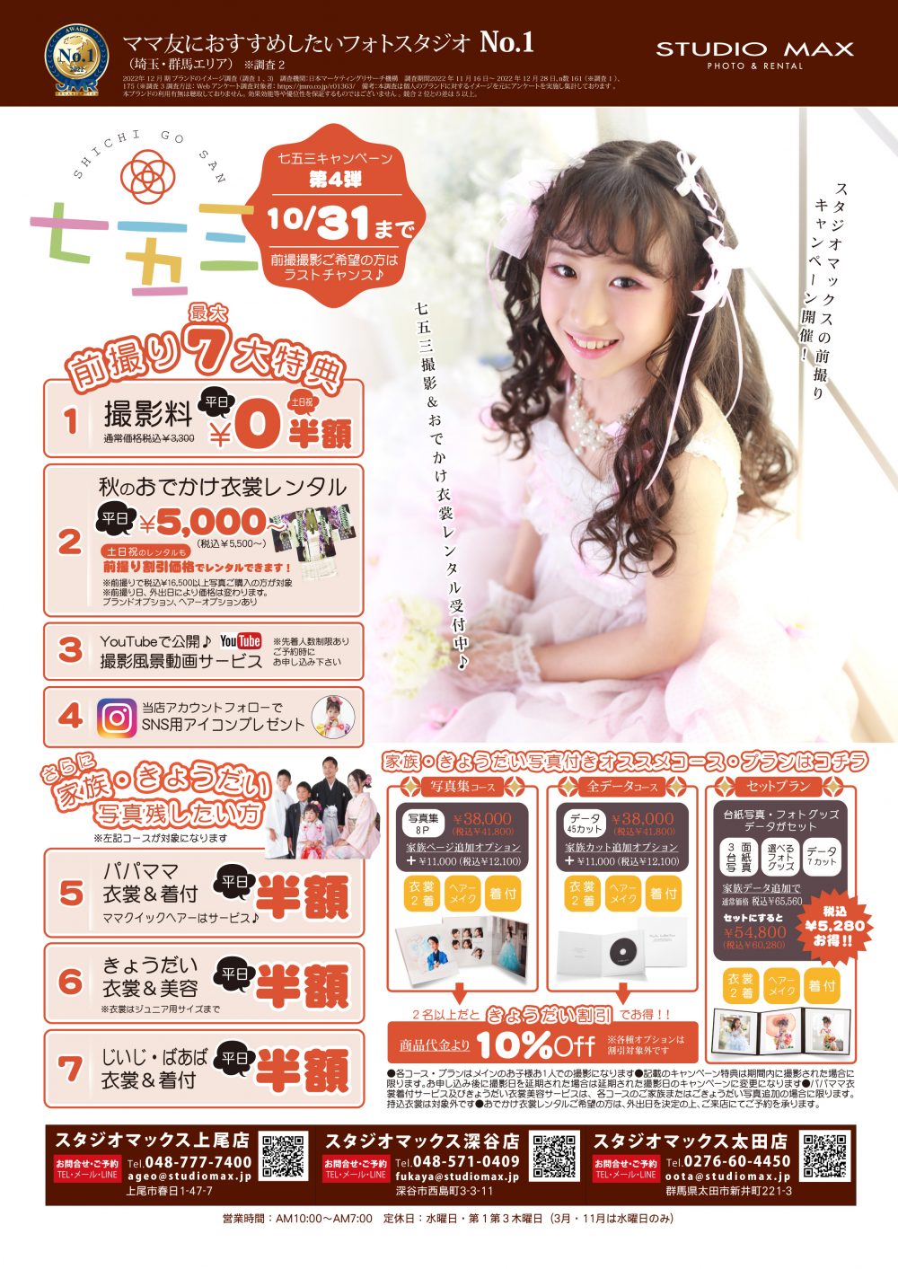 2023.9.26 お知らせ 深谷店 キャンペーン 上尾店 太田店 おすすめ情報 店鋪 七五三早撮りキャンペーン!10月31日まで スタジオマックス恒例の七五三早撮りキャンペーン第4弾がスタートしました(^▽^)/ キャンペーン内容は『撮影料平日0円』『パパママ衣装着付平日半額』や『お出かけ衣裳レンタル平日5,500円~』『SNSアイコンプレゼント!』など!他にも盛りだくさん♪ キャンペーン期限は10月31日まで♪ フェア内容についてはお気軽にお問い合わせ下さい! お問合せ・ご予約はこちら 前の記事へ 一覧へ 次の記事へ