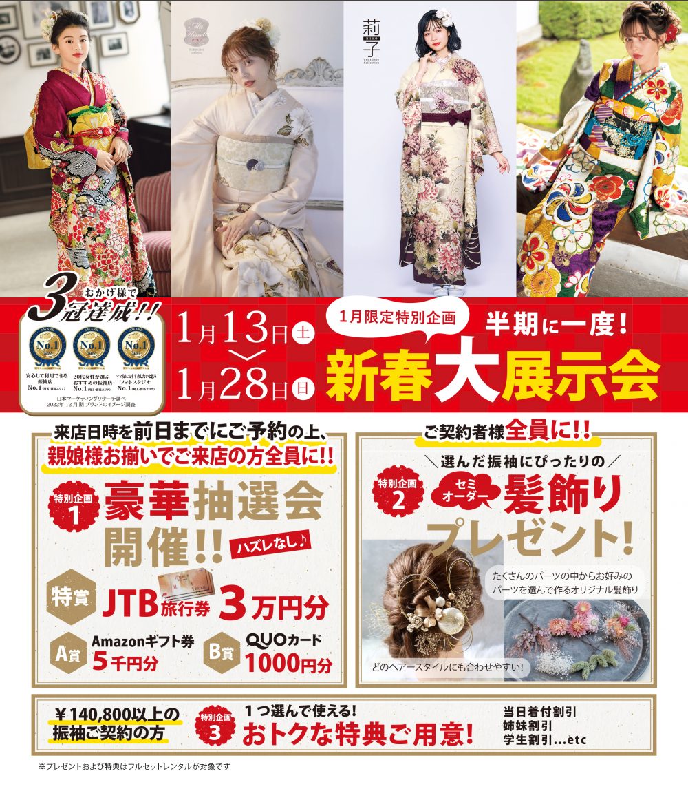 2023.12.10 お知らせ 深谷店 キャンペーン 上尾店 太田店 おすすめ情報 店鋪 1年に1度の新春振袖大展示会開催♪ 1/13(土)~1/28(日)にスタジオマックス全店で1年に1度の振袖大展示会を開催します♪ 新柄はもちろんたくさんの振袖が大集合!! お好みの色、お好みの柄で一生に一度の成人式を着飾りましょう(^^♪ 是非この機会に一度お店にお越しください(*´ω`*) 事前に展示会へ来場予約をしていただた方全員に、JTB旅行券が当たる大抽選会も開催! ※展示会のご予約は空きが無くなり次第受付終了となりますのでお早めにご予約をおススメします! お問合せ・ご予約はこちら 前の記事へ 一覧へ 次の記事へ