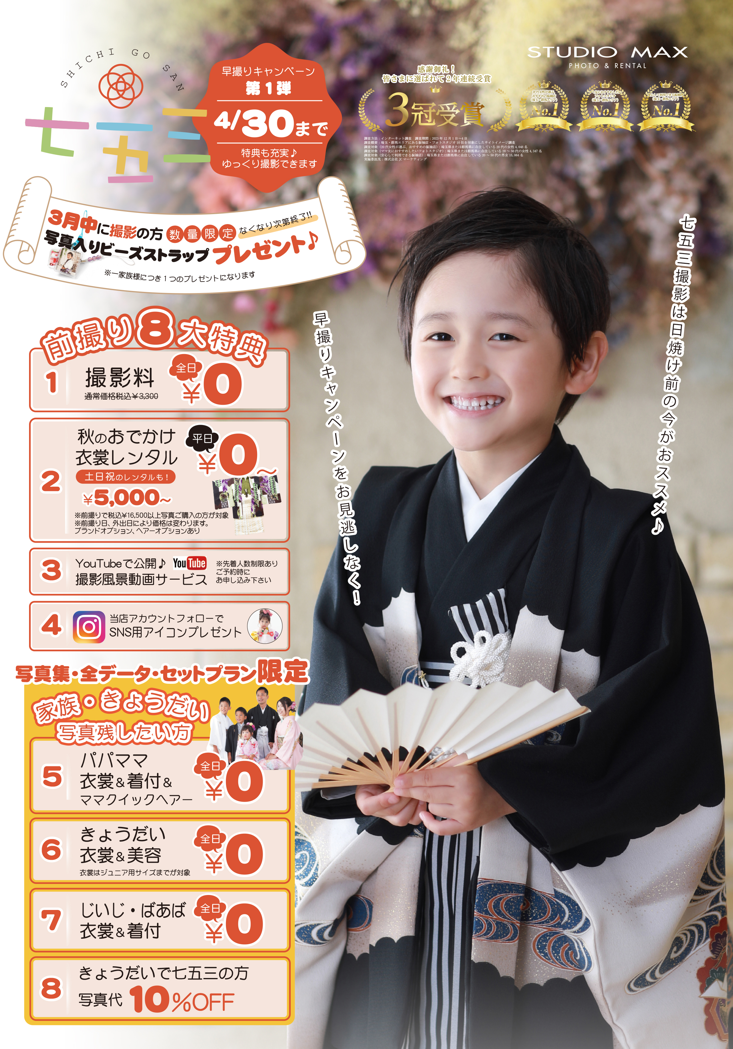 2024.3.2 お知らせ 深谷店 キャンペーン 上尾店 太田店 おすすめ情報 店鋪 七五三早撮りキャンペーン!【4月30日まで】 スタジオマックス恒例の七五三早撮りキャンペーン第1弾がスタートしました(^▽^)/ キャンペーン内容は『撮影料全日0円』や『秋のお出かけ衣裳レンタル平日0円~』『SNSアイコンプレゼント!』など!他にも盛りだくさん♪ キャンペーン期限は4月30日まで♪ フェア内容についてはお気軽にお問い合わせ下さい! お問合せ・ご予約はこちら 前の記事へ 一覧へ 次の記事へ