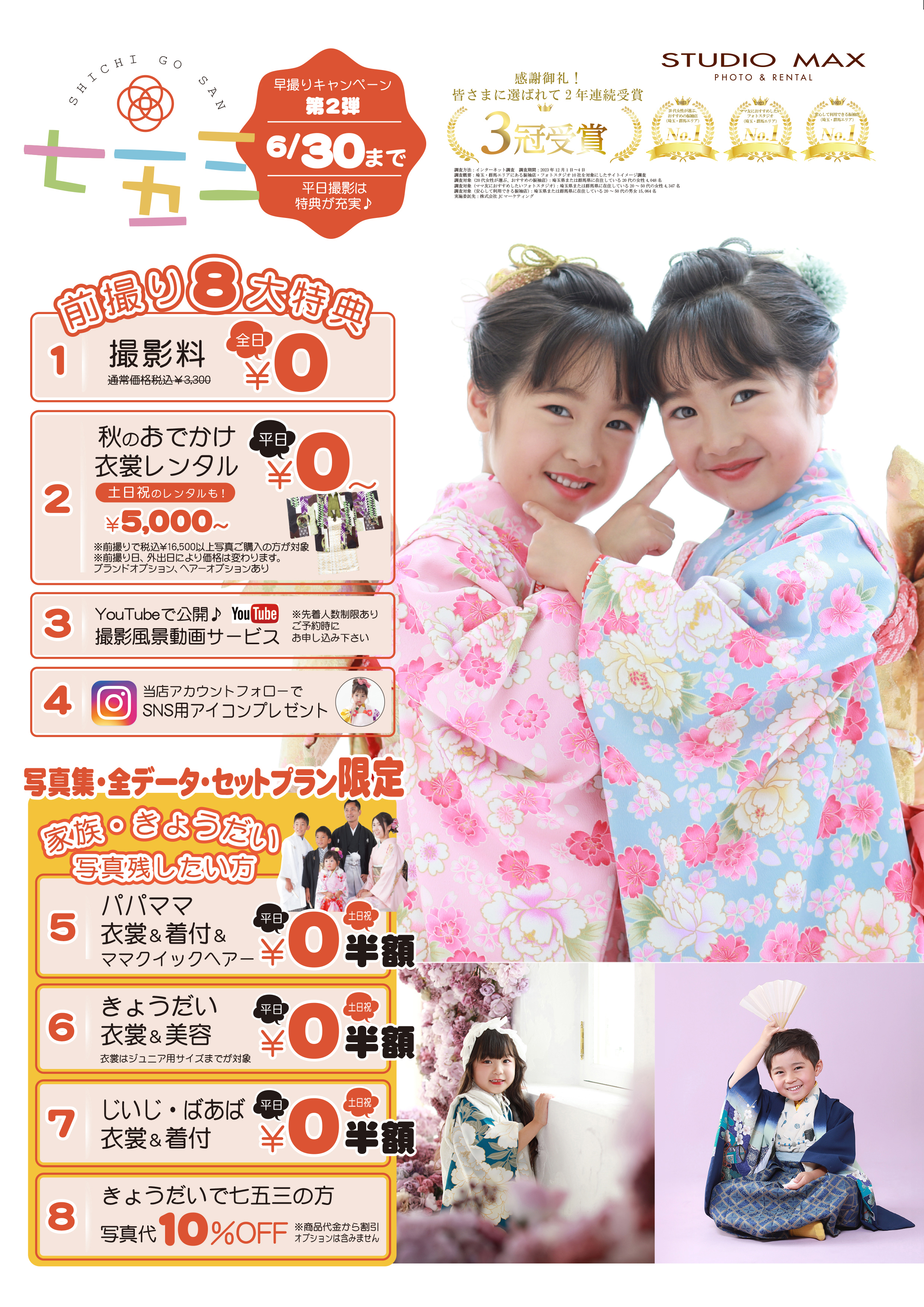 2024.5.28 お知らせ 深谷店 キャンペーン 上尾店 太田店 おすすめ情報 店鋪 七五三早撮りキャンペーン!【6月30日まで】 スタジオマックス恒例の七五三早撮りキャンペーン第2弾がスタートしました(^▽^)/ キャンペーン内容は『撮影料全日0円』や『秋のお出かけ衣裳レンタル平日0円~』『SNSアイコンプレゼント!』など!他にも盛りだくさん♪ キャンペーン期限は6月30日まで♪ フェア内容についてはお気軽にお問い合わせ下さい! お問合せ・ご予約はこちら 前の記事へ 一覧へ 次の記事へ