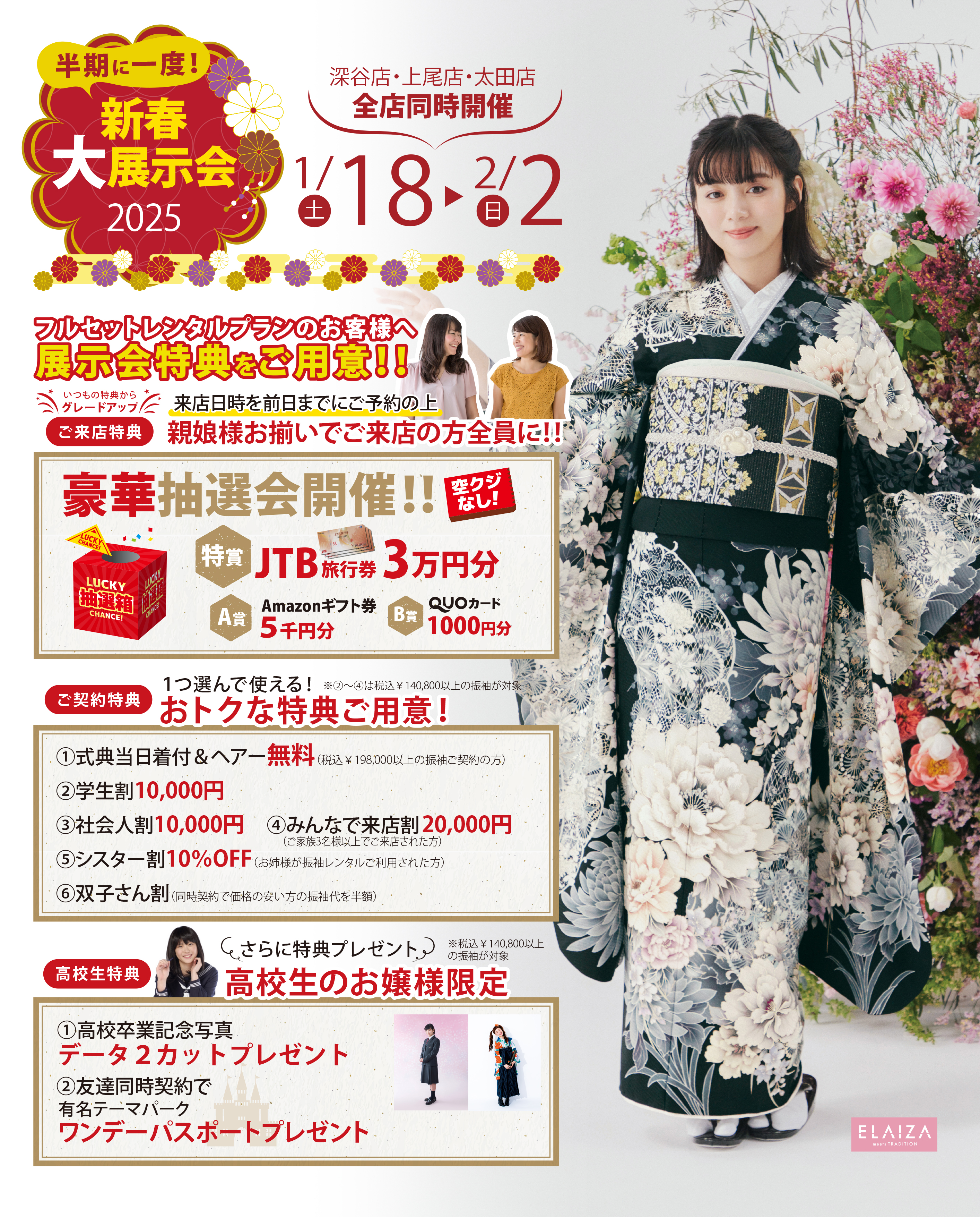 2024.12.15 お知らせ 深谷店 キャンペーン 上尾店 太田店 おすすめ情報 店鋪 2025年 全店新春大展示会のご案内♪【2025年1月18(土)~2月2日(日)まで!】 振袖 新春大展示会のご案内! 2025年1月18(土)~2月2日(日)、スタジオマックス全店で振袖大展示会開催中です♪ 新柄はもちろんたくさんの振袖ご用意!! お好みの色、お好みの柄で一生に一度の成人式を着飾りましょう(^^♪ さまざまな特典をご用意しております! 来店日時をご予約の上、是非この機会にお越しください(*´ω`*) ※展示会のご予約は空きが無くなり次第受付終了となりますのでお早めにご予約をおススメします! 他の振袖レンタルメニューはこちら お問合せ・ご予約はこちら 前の記事へ 一覧へ 次の記事へ