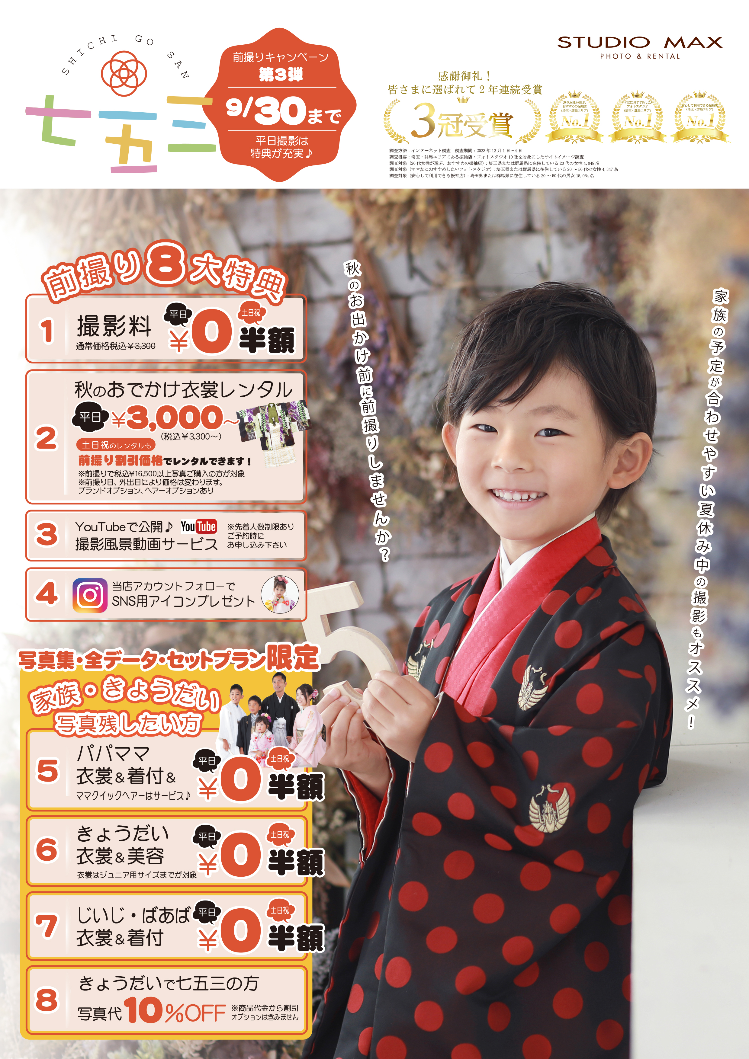2025.8.11 お知らせ 深谷店 キャンペーン 上尾店 太田店 おすすめ情報 店鋪 七五三早撮りキャンペーン!【8月31日まで】 2025年七五三早撮りキャンペーン、ご好評につき第3弾スタート!!(^▽^)/ キャンペーン内容は『撮影料 平日0円』や『秋のお出かけ衣裳レンタル平日3,300円~』『パパママ衣裳・着付平日0円!』など!他にも盛りだくさん♪ 夏休みを利用してご家族みなさまで、ぜひ撮影しませんか? キャンペーン期限は2025年8月31日まで♪ フェア内容についてはお気軽にお問い合わせ下さい! 他の七五三メニューはこちら お問合せ・ご予約はこちら 前の記事へ 一覧へ 次の記事へ