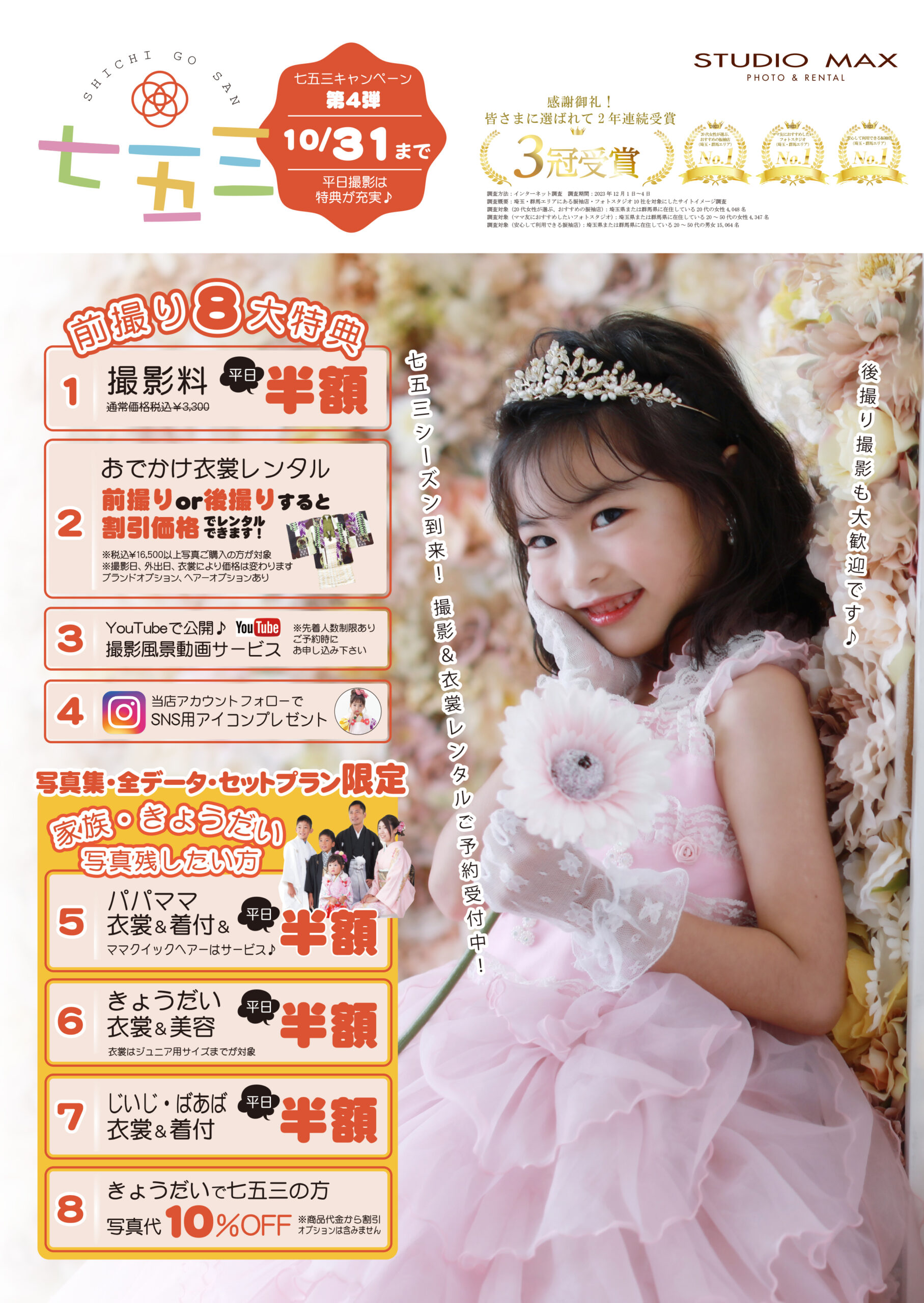 2025.9.30 お知らせ 深谷店 キャンペーン 上尾店 太田店 おすすめ情報 店鋪 七五三早撮りキャンペーン!【10月31日まで】 2025年七五三早撮りキャンペーン第4弾!!(^▽^)/ キャンペーン内容は『撮影料 平日半額』や『前撮りor後撮りで秋のお出かけ衣裳レンタル割引!』『当店のインスタアカウントのフォローでSNS用アイコンプレゼント!』など!盛りだくさん♪ 秋のお参り前に、前撮りをするとお参り当日もゆっくりできます♪ キャンペーン期限は2025年10月31日まで! フェア内容についてはお気軽にお問い合わせ下さい(*’ω’*) お問合せ・ご予約はこちら 前の記事へ 一覧へ 次の記事へ